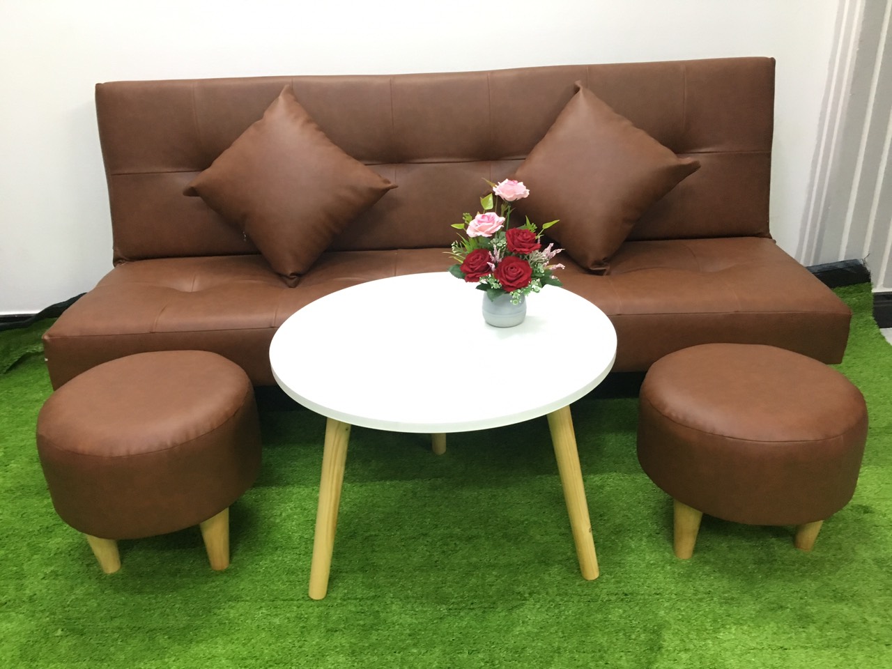 Mua tại TiktokSofa bed, sofa giường 1m7x90, có thể bật ra thành giường để nằm Kích thước 1m7x90 (kích thước phổ thông) Chất liệu: khung gỗ dầu, mút d30, simili Bao gồm: ghế dài 1m7x90, 2 gối ôm, 2 ghế đôn tròn, bàn tròn đường kính 60x45 The sofa can be unfold to be bed Size: 170cm x 90 including sofa bed, 2 cushions, 2 ottomans and white table