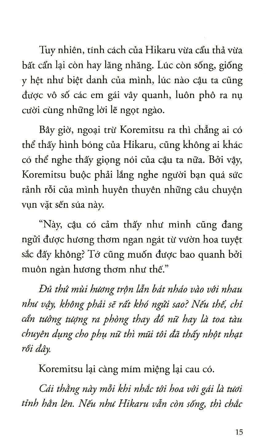 Đúng thế, Hikaru không có gì thay đổi so với bình thường. Lúc nào cậu ta cũng vô tư, lúc nào cũng vô cùng yêu thương hoa và các cô gái. Lúc nào cậu ta cũng luôn tươi cười. Dầu vậy, Koremitsu lại cảm thấy bối rối mỗi khi Hikaru đưa mắt nhìn xuống, trầm mặc. Đó là vì Hikaru đã từng nói những lời như thế này. …Ngay cả nếu như mười năm sau người đứng bên cạnh Aoi là cậu, tớ cũng sẽ ở trên trời cao nhìn xuống và yêu thương các cậu. Cậu ta đã nở một nụ cười rất đỗi trong trẻo, dịu dàng và buồn bã mà thì thầm như vậy, đôi mắt thanh thản nhìn thẳng vào Koremitsu. “Đồ ngốc! Cậu đang hiểu lầm cái gì đấy. Tôi với Aoi làm sao mà có cái gì với nhau được. Lý do Aoi nắm lấy tay tôi chỉ là… chỉ là vì tôi gặp lại người mẹ đã bỏ nhà ra đi, là đàn ông mà lại mếu máo khóc, nên cô ấy mới muốn an ủi tôi mà thôi!” Khi Koremitsu cau mày phản bác, Hikaru chỉ nở nụ cười rất dỗi trong lành. “Đúng thế. Có lẽ là tớ đã để ý quá nhiều rồi. Tuy nhiên, vì tớ có thể biến mất khỏi thế giới này bất cứ lúc nào, nên tớ chỉ muốn nói với cậu rằng: Dù sau này Koremitsu có chọn con đường nào đi nữa, tớ cũng sẽ chúc phúc cho cậu.” Nghe như thể Hikaru đang nói ra di ngôn với giọng điệu trưởng thành và thanh thản. Koremitsu vẫn cau có mặt mày, không thốt ra được một lời nào.