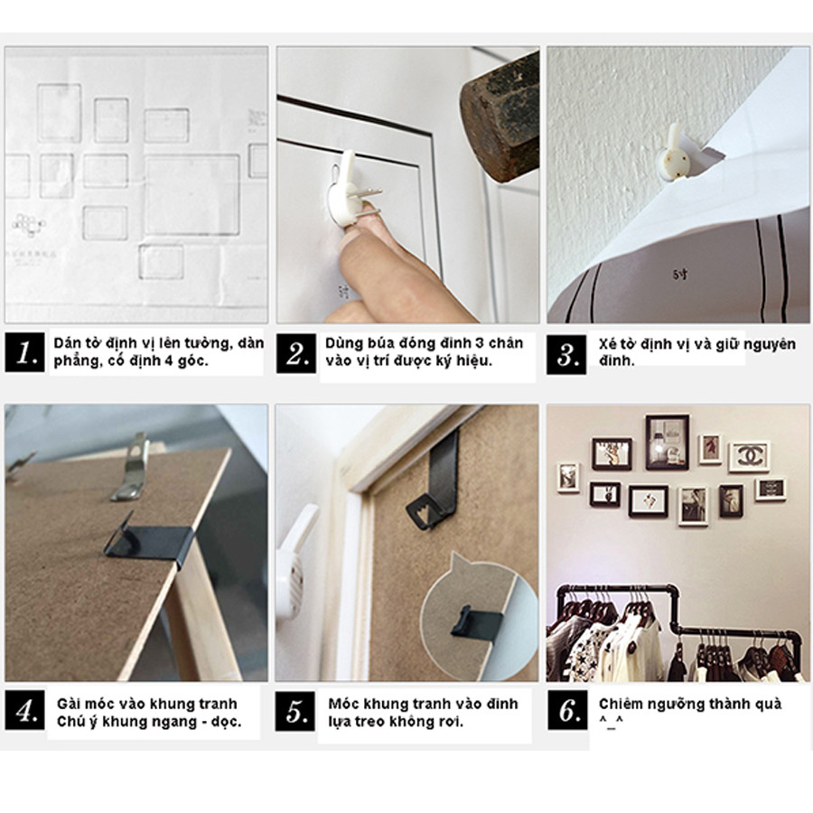 • Bước 4: Móc hết khung ảnh lên đinh đã đóng, chú ý móc đinh và móc khung phải khớp với nhau.