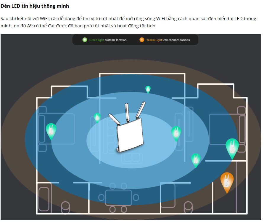 - Đèn LED Hiểu thị Cường độ Tín hiệu WiFi Thông minh để giúp lựa chọn vị trí tối ưu một cách dễ dàng.