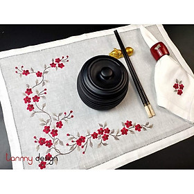 ✨Bộ lót đĩa và khăn ăn thêu tay hoa đào leo.