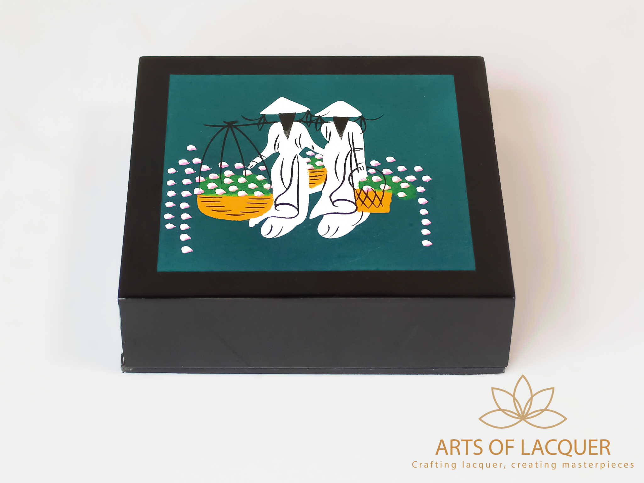 Đây là một bộ sáu chiếc đế lót ly được thiết kế vô cùng tinh xảo và độc đáo. Mỗi chiếc lót ly có hình vuông, được đặt trong một khung màu đen mạnh mẽ tạo nên sự tương phản rõ rệt với hình ảnh trung tâm. Nền của hình ảnh trên lót ly là màu xanh dương nhẹ nhàng, tạo cảm giác thanh bình và dễ chịu. Hình ảnh nổi bật trên nền xanh là hai người phụ nữ mặc trang phục áo dài truyền thống Việt Nam và đội trên đầu chiếc nón lá. Trên vai họ là những gánh hoa chứa những bông hoa màu sắc tươi sáng mang đậm bản sắc văn hóa Việt.
