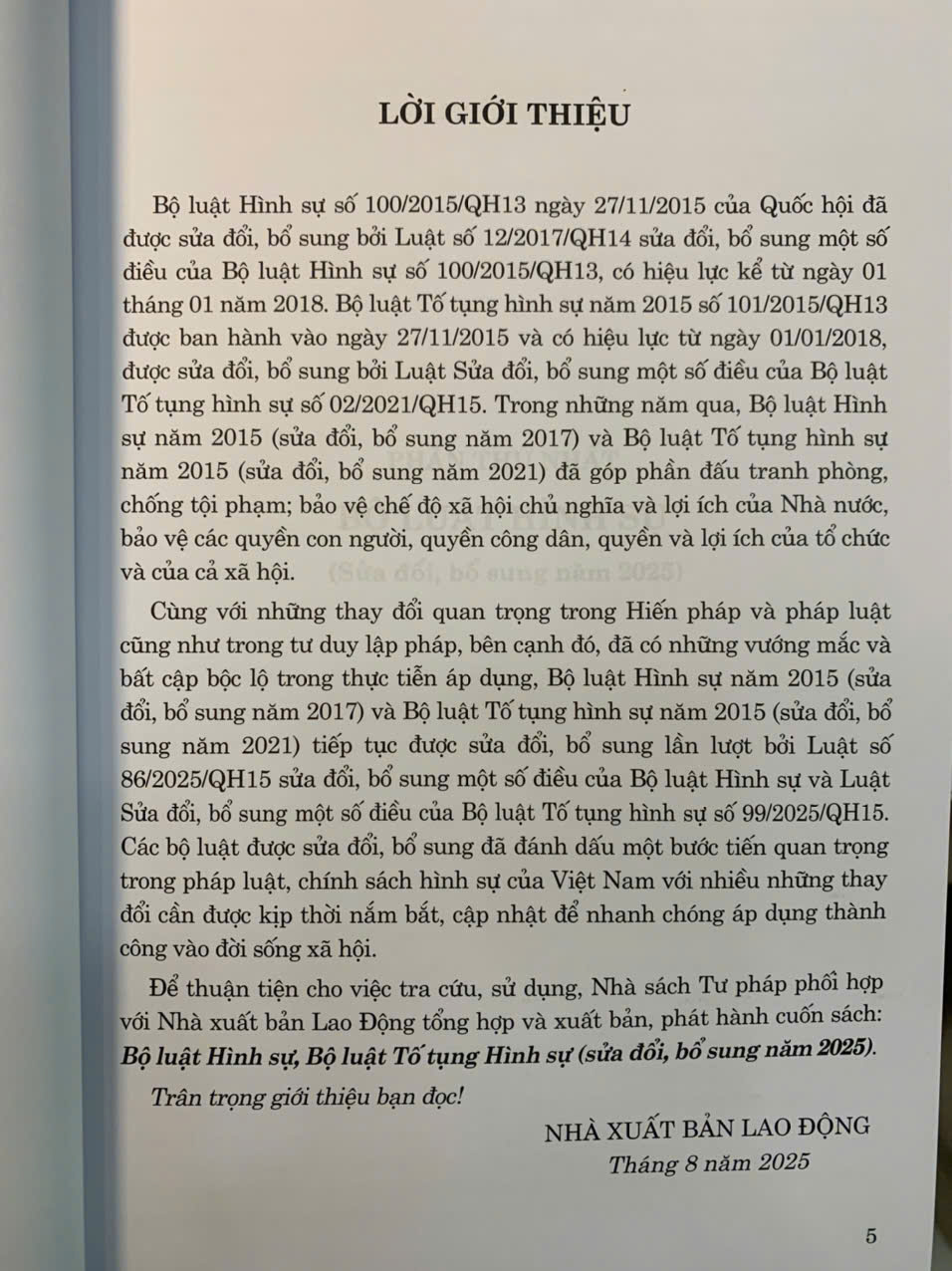 Sách - Bộ luật Hình sự, Bộ luật Tố tụng Hình sự (sửa đổi, bổ sung năm 2025) Tác giả: Quốc Hội Nhà xuất bản: Lao Động Ngày xuất bản: 9.2025 Đơn vị phát hành: