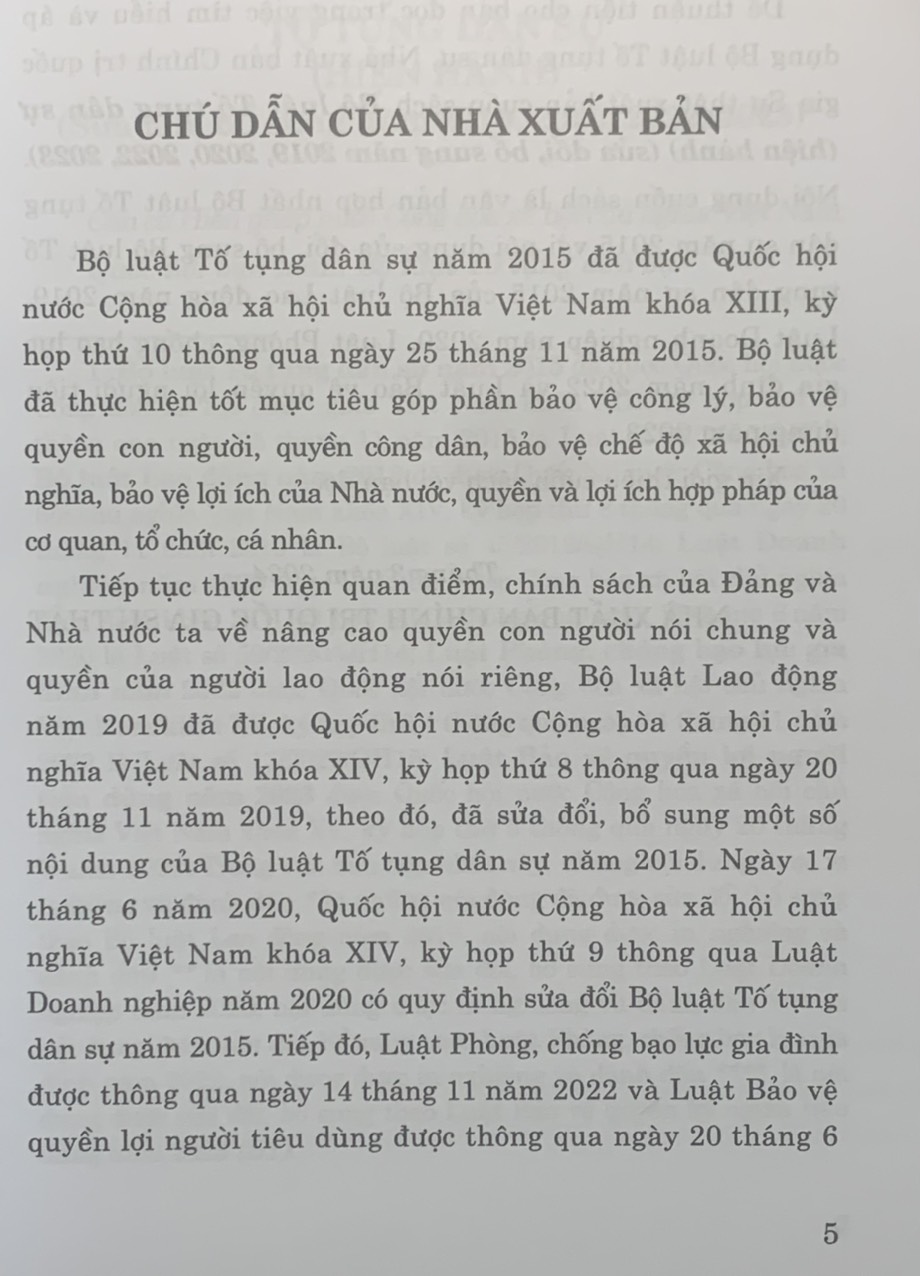 Để thuận tiện cho bạn đọc trong việc tìm hiểu và áp dụng Bộ luật Tố tụng dân sự, Nhà xuất bản Chính trị quốc gia Sự Bộ luật Tố tụng dân sự (hiện hành) (sửa đổi, bổ sung năm 2019, 2020, 2022, 2023). Nội dung cuốn sách là văn bản hợp nhất Bộ luật Tố tụng dân sự năm 2015 với nội dung sửa đổi, bổ sung Bộ luật Tố tụng dân sự năm 2015 của Bộ luật Lao động năm 2019, Luật Doanh nghiệp năm 2020, Luật Phòng, chống bạo lực gia đình năm 2022 và Luật Bảo vệ quyền lợi người tiêu dùng năm 2023.
