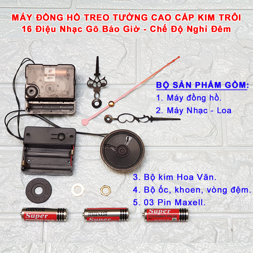 • Bộ máy bao gồm: Máy Nhạc chuông, Loa đã được kết nối với Máy đồng hồ Treo tường Eastar, Bộ 3 Kim Hoa Văn (kim giờ, kim phút và kim giây), Ốc, Vòng khoen và Pin như hình chụp.