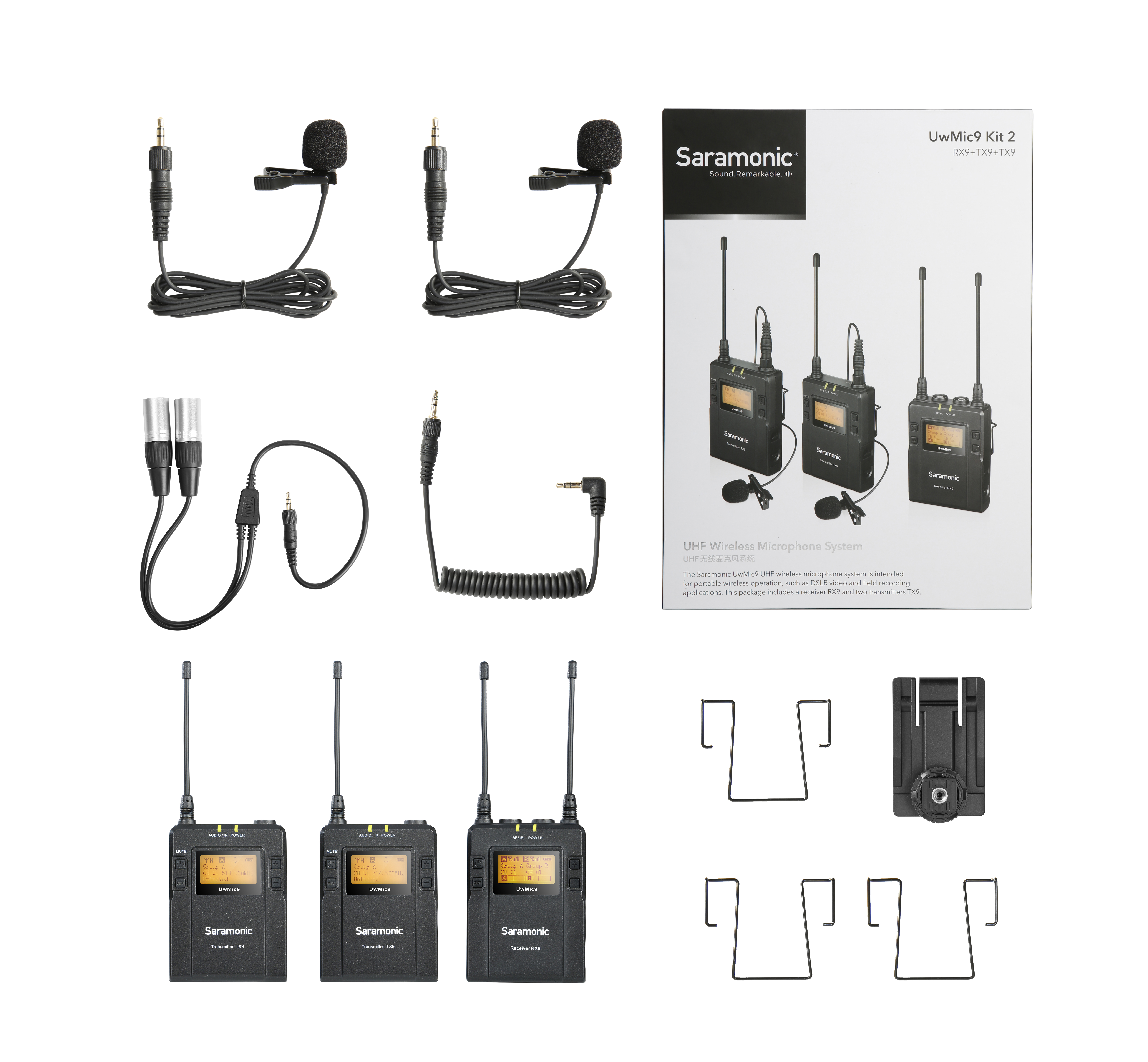 Bao gồm bộ thu không dây có thể gắn máy ảnh, hai bộ phát không dây và micro lavalier dạng kẹp.