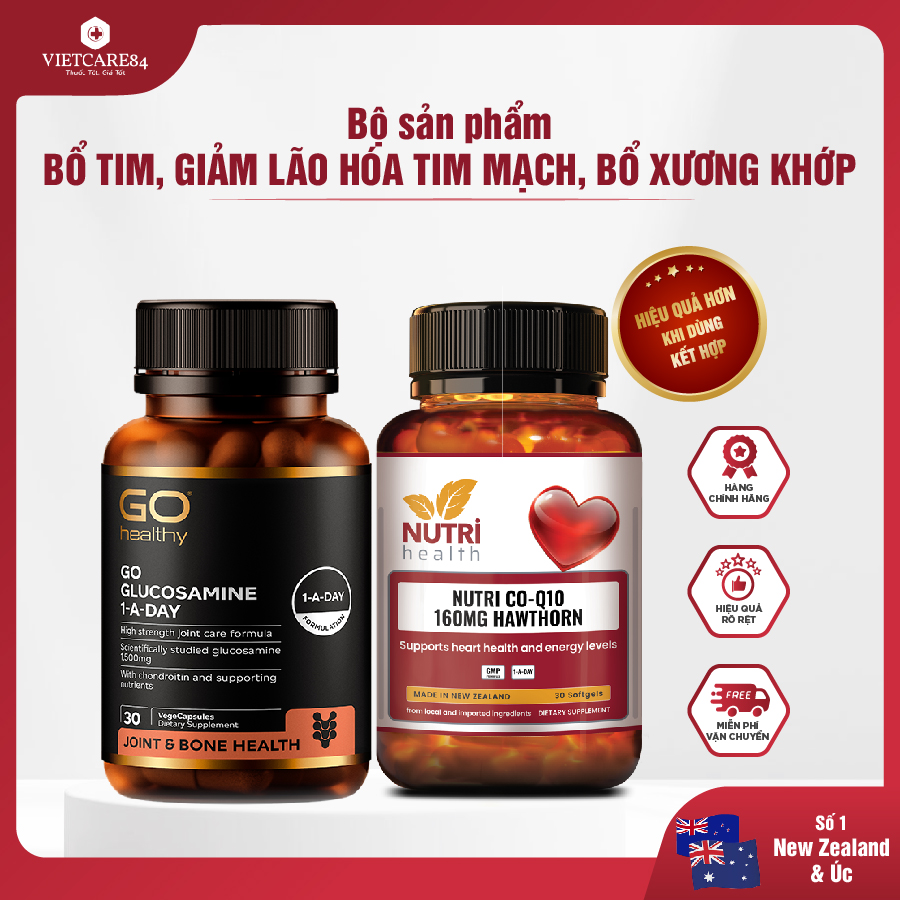 ✨Bộ Sản Phẩm Bổ Tim, Bổ Xương Khớp New Zealand: Bổ Tim Nutri Co Q10 160g Hawthorn -30 Viên; Go Glucosamine 1-A-Day 1500mg