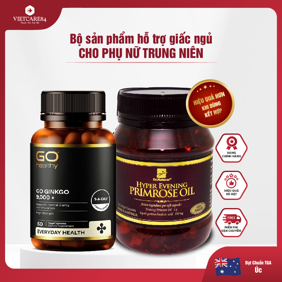 BỘ SẢN PHẨM HỖ TRỢ GIẤC NGỦ CHO PHỤ NỮ TUỔI TRUNG NIÊN GIÚP CẢI THIỆN TÌNH TRẠNG ĐAU ĐẦU, MẤT NGỦ, GIÚP NGỦ NGON, GỒM : + Viên uống bổ não GO GINKGO 9000+ (60 viên) - dùng 2 tháng + Viên uống nội tiết tố nữ HYPER EVENING PRIMROSE OIL (180 viên) - dùng 3 tháng I/ Viên uống bổ não GO GINKGO 9000+ Thực phẩm bảo vệ sức khỏe GO GINKGO 9000+ được sản xuất tại New Zealand giúp cải thiện trí nhớ và tăng khả năng tập trung. Với công thức 7 trong 1, bổ não ginkgoNew Zealand GO Ginkgo 9000+ kết hợp Ginkgo, Bacopa, Hawthorn hỗ trợ tăng cường hoạt động não bộ, giúp trí óc sang suốt và tập trung hơn. ĐIỂM KHÁC BIỆT CỦA VIÊN BỔ NÃO GINKGO NEW ZEALAND GO GINKGO 9000+: 1. Số 1 New Zealand, nhập khẩu nguyên hộp chính hãng. GO Ginkgo 9000+ là sản phẩm của GO Healthy, hãng dược phẩm được khách hàng tin dùng nhất tại New Zealand 2. Công thức tối ưu nhất. Bạn khó có thể tìm được một sản phẩm bổ não kết hợp giữa hàm lượng Ginkgo cao (chiết xuất Ginkgo 9000mg) với chiết xuất Rau đắng biển (Bacopa monnieri)...2000mg và chiết xuất Sâm siberian (Eleutherococus senticosus)...650mg trong một viên nang 3. Dùng tốt cho người thiểu năng tuần hoàn não, đau đầu mất ngủ, người bị tiền đình, chóng mặt, người bị tai biến mạch máu não