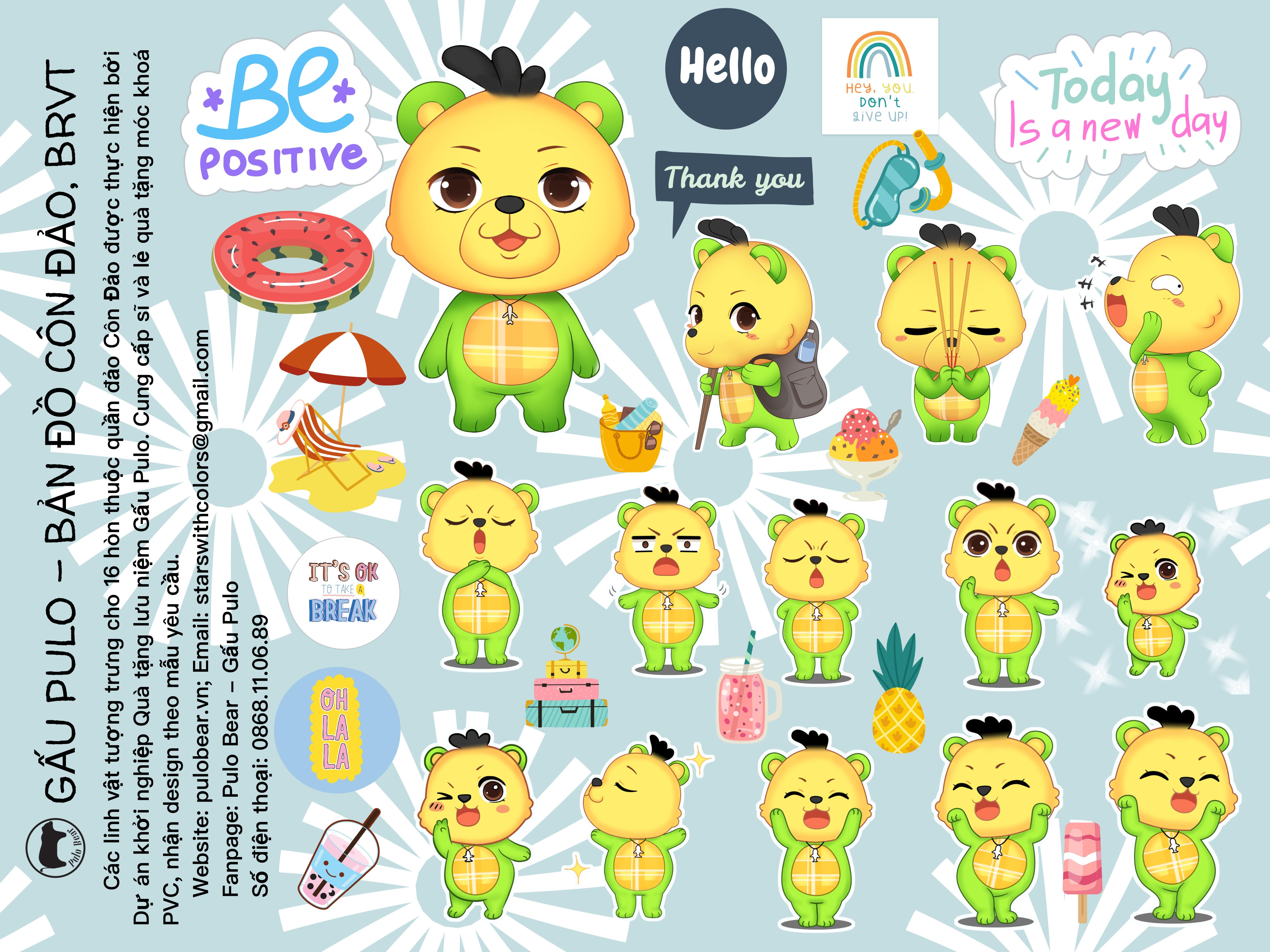 Thiết kế độc quyền: Hình ảnh Gấu Pulo được vẽ với nhiều dáng vẻ dễ thương: cười, vẫy tay, đọc sách, vui chơi…