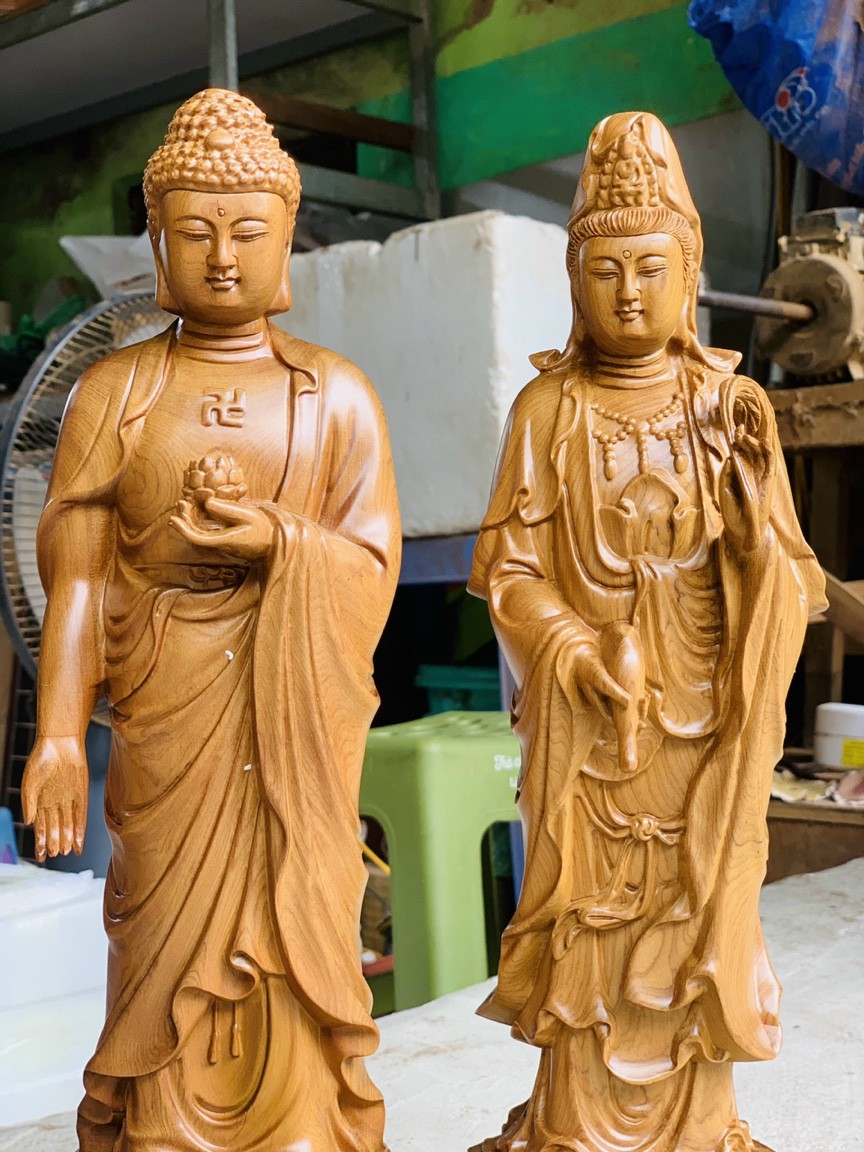 ✨Bộ tượng phật tam thánh bằng gỗ bách xanh thơm nức kt cao 50×15×15cm