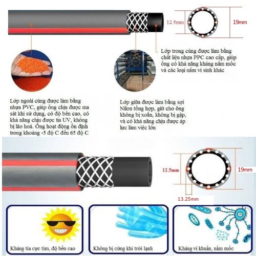 - 20 mét ống trong khung lô và 1 mét ống cấp nước phi 14 kết cấu 3 lớp chất lượng cao