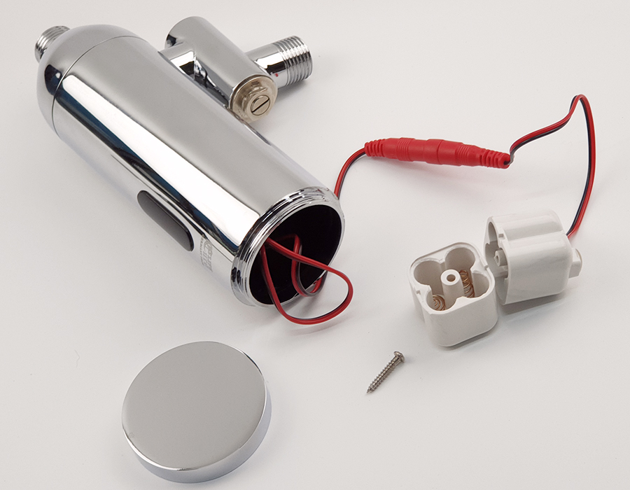 Hộp chứa pim nằm ngay trong thân van, dễ thay thế. Chỉ việc xoay nắp thân, mở ốc, thay pin vào rồi sử dụng