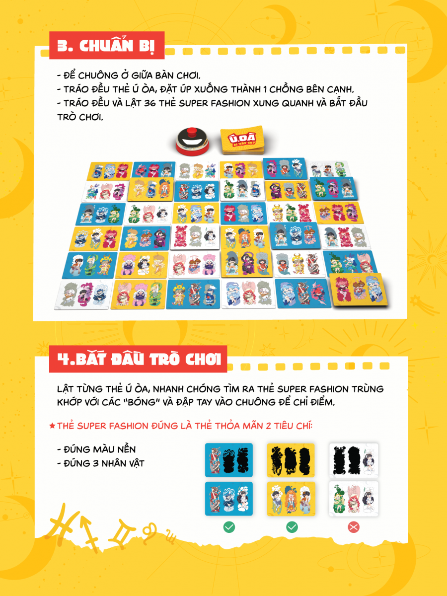 Đặt chuông, 36 thẻ Super Fashion nằm ngửa giữa bàn và tráo các thẻ Ú Òa thành 1 chồng đặt úp bên cạnh