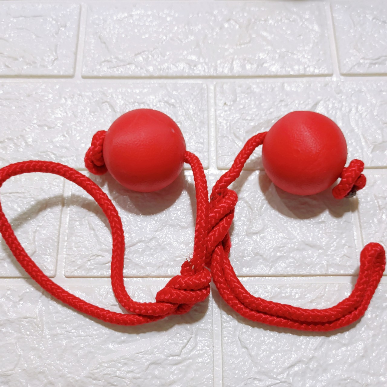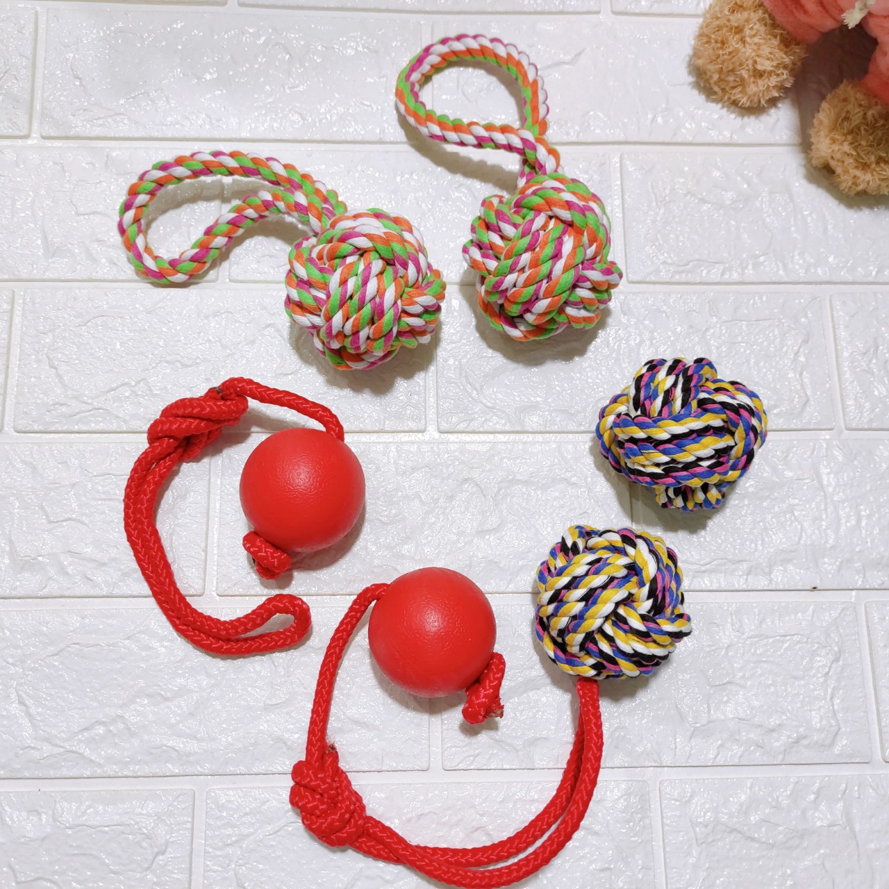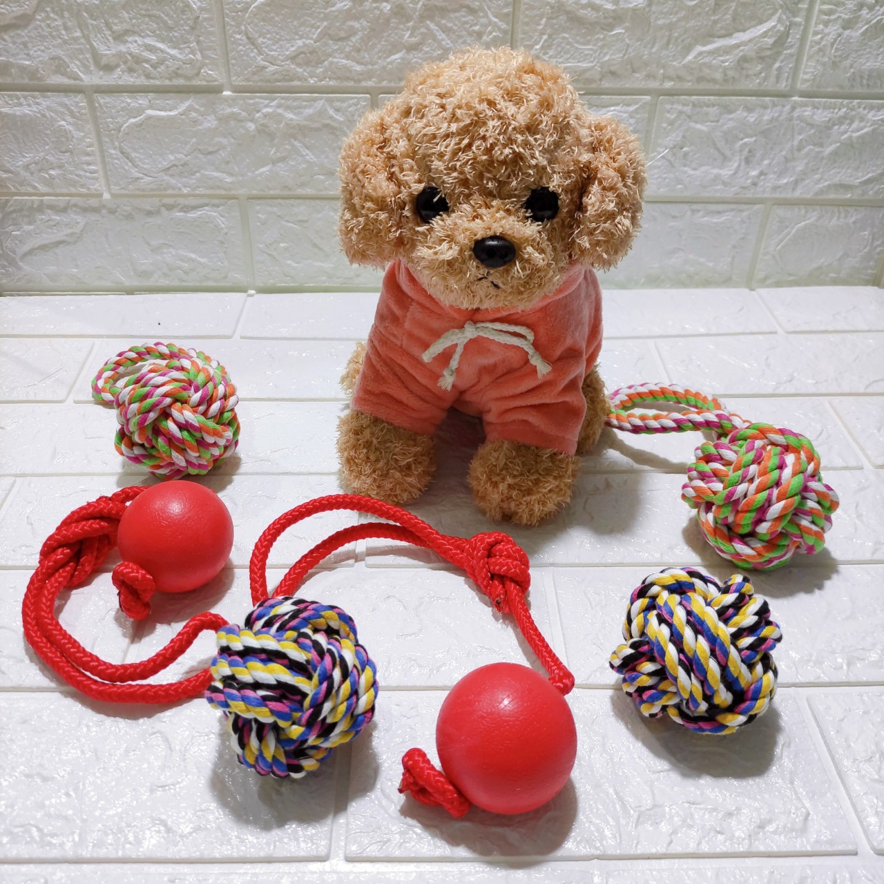 Bóng cao su có kèm dây thừng cho cún bạn vui đùa, cún có thể gặm chơi, hoặc dùng trong huấn luyện, bạn ném quả bóng ra xa và cún sẽ chạy tới nhặt quả bóng về, tạo tương tác giữa bạn và cún