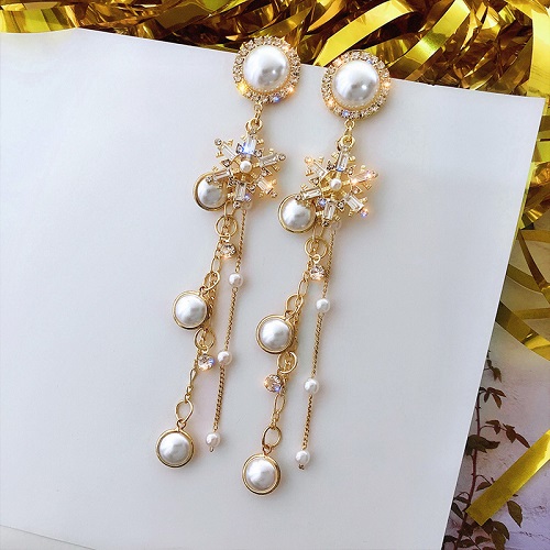 Bông tai đính ngọc trai kết đá dáng dài đi tiệc, bông tai sang chảnh