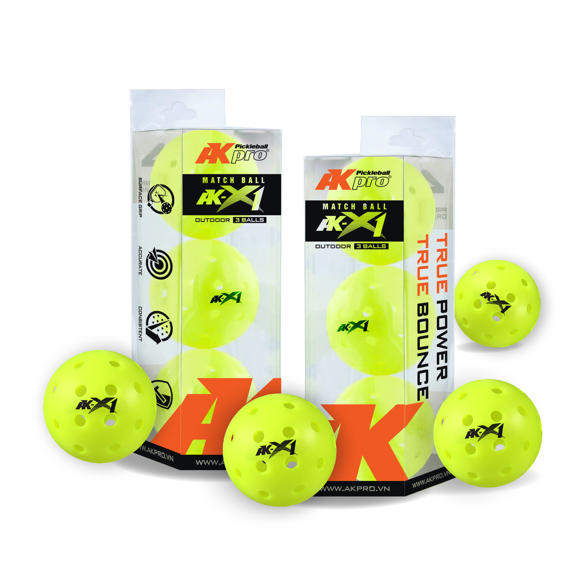 Bóng Pickleball AK-X1 Sử dụng vật liệu PE cao cấp được đúc khuyên khối, 40 lỗ. Trọng lượng, kích thước và độ nảy tiêu chuẩn ngoài trời. Bóng có đường bay ổn định, bám mặt vợt và rất bền.