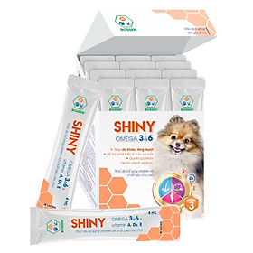 - Phân loại 2: set 10 gói lẻ, mỗi gói 4ml Mô tả Giúp da khỏe, lông mượt Hỗ trợ phát triển trí não và mắt Duy trì sức khỏe hệ tim mạch và khớp Thành phần Trong 1 lít có chứa Béo thô (min)……………………………………….. 80% Vitamin A (min)………………………….160 000 IU Vitamin D3 (min)……………………………40 000 IU Vitamin E (min)………………………………16 000 IU Dung môi (dầu hướng dương) vừa đủ….1 lít Nguyên liệu: Dầu cá (omega 3, omega 6), vitamin A, vitamin D3, vitamin E, dầu hướng dương. Công dụng Shiny là sản phẩm cung cấp dinh dưỡng gồm các vitamin và các acid béo thiết yếu từ tự nhiên. Sử dụng thường xuyên để duy trì da và bộ lông khỏe mạnh, giúp n.g.ă.n n.g.ừ.a các vấn đề về da như n.g.ứ.a, b.o.n.g t.r.ó.c và k.h.ô da. Ngoài ra, Shiny còn giúp thú cưng có trái tim khỏe mạnh, cũng như c.ả.i t.h.i.ệ.n khả năng vận động, g.i.ả.m đ.a.u khớp trên chó. Liều dùng Cho u.ố.n.g trực tiếp hoặc t.r.ộ.n với thức ăn theo li.ều: 1 ml/2,5 kg thể trọng/ ngày. Lưu ý: