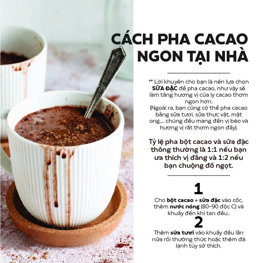 - Ngoài ra, cacao còn được sử dụng để pha chế các loại thức uống bổ dưỡng, ️HƯỚNG DẪN SỬ DỤNG: Bước 1: Đun sôi nước: Để cacao tan đều không bị vón cục, bạn hãy dùng nước nóng 70-100 độ. Bước 2: Cho bột cacao vào ly: Sử dụng khoảng 2-3 muỗng cafe bột cacao nguyên chất Bước 3: Cho sữa đặc hoặc đường: Vì cacao nguyên chất nên chưa có vị ngọt, ta thêm sữa đặc sẽ giúp hương vị tách cacao thơm ngon hơn. Lượng ngọt tùy theo khẩu vị bản thân. Bước 4: Đánh lên thật đều: Việc đánh cacao cùng sữa trước khi cho nước giúp bột tan đều hơn và không bị vón Bước 5: Chế nước nóng vào tách rồi khuấy tan hỗn hợp để bột dậy mùi thơm hơn. Đối với cacao nóng khoảng 120ml nước. Nếu uống lạnh bạn cho ít nước hơn để thưởng thức cùng đá. ️THÔNG TIN SẢN PHẨM: Thành phần: 100% cacao được lựa chọn từ vùng trồng sạch và chất lượng. Khối lượng: 250g, 500g HSD: 12 tháng kể từ ngày sản xuất. BẢO QUẢN: Nơi khô ráo, thoáng mát, tốt nhất trong ngăn mát tủ lạnh. Đậy kín bao bì sau khi sử dụng. ️MỘC LAN CAM KẾT: ️Sạch - Lành - Thuần Tự Nhiên. ️Luôn ưu tiên sản xuất sản phẩm mới nhất đến tay khách hàng. ️Đảm bảo Vệ sinh an toàn thực phẩm và có giấy chứng nhận đầy đủ. ️Chuyên cung cấp các sản phẩm sạch, thuần tự nhiên và tốt cho sức khỏe. 3 KHÔNG:
