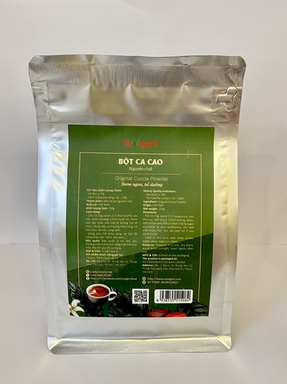 Mua tại TiktokBột Cacao nguyên chất Suvigort Bột cacao nguyên chất 100% mang đến nguồn năng lượng tuyệt vời và hương vị thơm ngon tự nhiên, hoàn toàn không phụ gia, hoá chất. Cacao được chứng minh là nguồn cung cấp nhiều dưỡng chất và khoáng chất, trong đó có axit oleic vô cùng tốt cho sức khỏe, tim mạch, giúp ổn định huyết áp, giảm nguy cơ tiểu đường, giúp tinh thần minh mẫn, giảm mệt mỏi, giảm stress và giàu chất chống oxy hoá. Sản phẩm phù hợp cho mọi đối tượng sử dụng. Hạn sử dụng: 12 tháng từ ngày sản xuất. ️Liên hệ Suvigort Food để biết thông tin sản phẩm: ️ 0243 5252288 - 0908235588