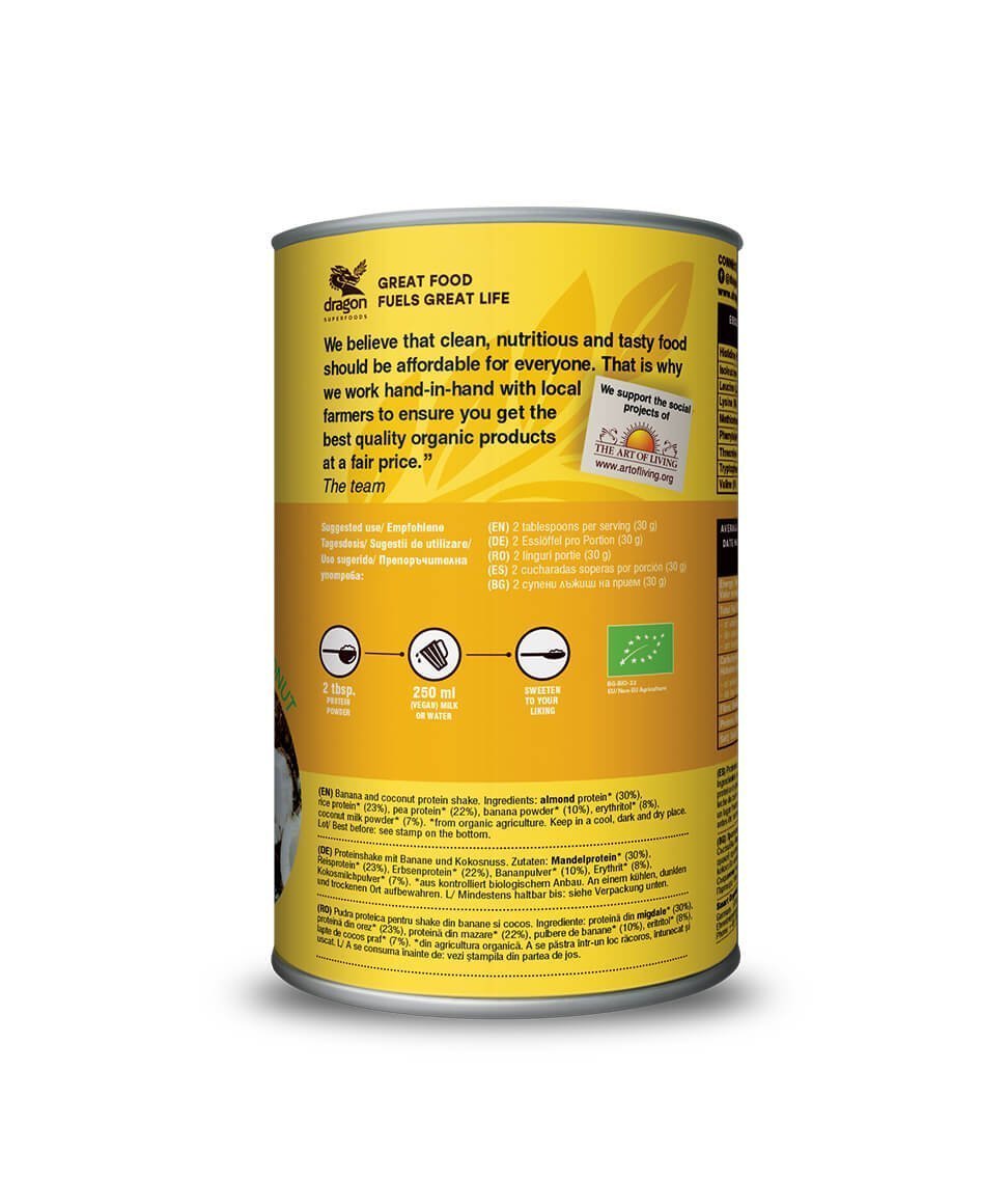 - Bột Protein shake chuối và dừa hữu cơ 450g - Dragon Superfoods Bột protein shake chuối và dừa Dragon Superfoods là thức uống pha sẵn thơm ngon với 52% hàm lượng đạm thực vật. Cơ thể có thể hấp thụ dễ dễ dàng các dưỡng chất để bắt đầu một ngày mới trước và sau khi tập thể dục. Đó là sự kết hợp của các thành phần hữu cơ - một giải pháp vô cùng nhanh chóng cho một ngày bận rộn. Protein thực vật làm phong phú thực đơn với các axit amin, và hương vị thơm ngon của chuối đồng thời kết hợp hoàn hảo với dừa béo ngậy.