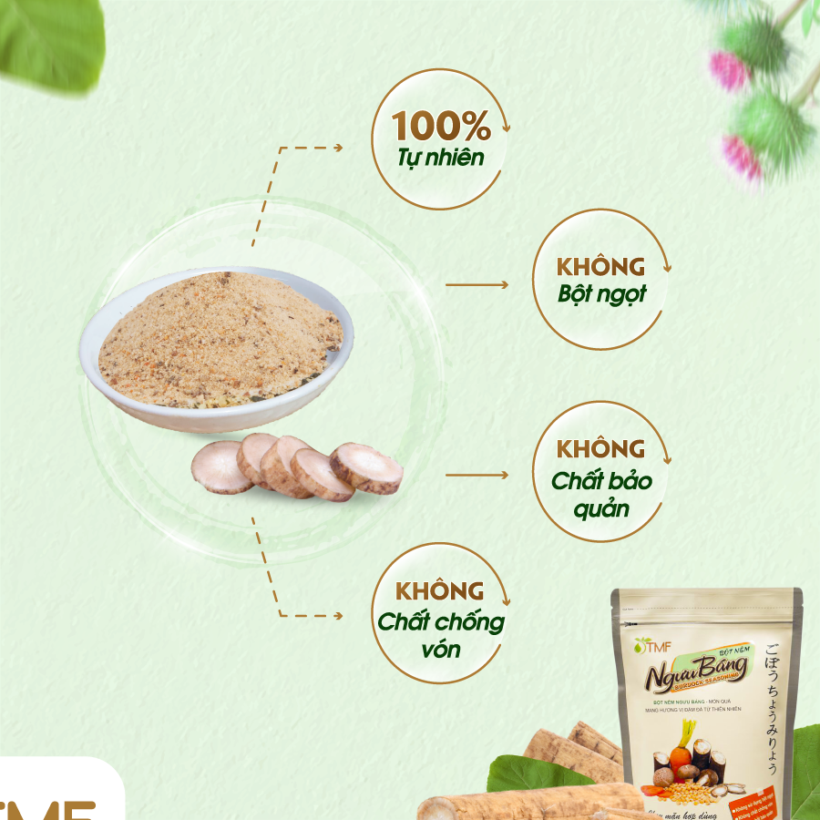 Bột nêm Ngưu Báng – Món quà mang hương vị đậm đà từ thiên nhiên. Thành phần: muối, ngưu báng 30%, nấm đông cô, cà rốt, protein đậu nành, chiết xuất lúa mạch, đường vàng.