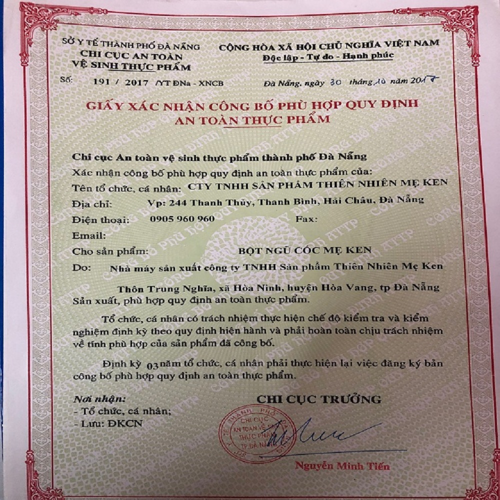 - Cuối cùng, ngũ cốc sạch đã được Sở Y Tế chứng nhận VSATTP và DUY NHẤT CHỈ 7 LOẠI HẠT MÀ KHÔNG CÓ CHẤT GÌ KHÁC Sản phẩm làm ra là cả một tâm huyết. Mong muốn mang tới những sản phẩm chuẩn thiên nhiên thực sự chất lượng, sạch và tốt. Đó đang và sẽ luôn là hướng đi mà Mẹ Ken thực hiện. THÀNH PHẦN: Hạt sen luôn tim, mè đen, đậu đen xanh lòng, đậu đỏ, đậu xanh, đậu cút, đậu ván, đậu nành, gạo huyết rồng CÔNG DỤNG: Tăng cân, giảm cân, cho trẻ ăn dặm, cung cấp vitamin, khoáng chất, giúp ăn ngon ngủ tốt, da dẻ mềm mại, chống lão hóa, dễ tiêu hóa, bổ dưỡng, giúp nhuận tràng tốt. Bổ sung chất dinh dưỡng cho người già yếu. Lợi sữa cho mẹ đang nuôi con nhỏ. Ăn dặm cho trẻ CÁCH DÙNG: ĐỂ TĂNG CÂN : Nắng nóng ăn uống dễ thiếu chất, lại dễ bị nhiệt. Sau khi ăn sáng hoặc trước khi ngủ ta nên bổ sung 1 ly BỘT NGŨ CỐC SIÊU SẠCH VÀ BỔ DƯỠNG MẸ KEN. MÈ ĐEN và HẠT SEN giúp cơ thể giải nhiệt, bồi bổ cơ thể, da dẻ hồng hào, giúp ngủ ngon, chống táo bón, … Các loại ĐẬU ĐEN, ĐẬU XANH, ĐẬU ĐỎ, ĐẬU NÀNH giúp cơ thể bổ sung hầu như đầy đủ tất cả khoáng chất, sinh tố A,B, C, … dưỡng nhan, giải độc, thanh nhiệt và tăng sức đề kháng. Ngoài ra GẠO LỨT HUYẾT RỒNG có lớp cám dày giúp bổ tỳ, ngăn ngừa cảm ho và chứa nhiều vitamin B, … Bên cạnh đó, ĐẬU NÀNH và MÈ ĐEN còn giúp tăng size vòng 1. ĐỂ GIẢM CÂN : Việc nhịn ăn để giảm cân khiến cơ thể thiếu chất, giảm sức đề kháng, da dẻ xấu… Uống 1 ly BỘT NGŨ CỐC SIÊU SẠCH VÀ BỔ DƯỠNG MẸ KEN thay bữa sáng, bữa trưa ăn uống như bình thường, bữa tối uống 1 ly và sau đó ăn 1 cái trứng lộn hoặc ăn nhẹ trước 7h tối. Dưỡng chất tự nhiên isoflavones có trong ĐẬU NÀNH giúp cân bằng nội tiết tố nữ, ức chế tích tụ chất béo ở bụng, đùi, mông, giúp vóc dáng phụ nữ mềm mại, nữ tính hơn mà vòng 1 vẫn tăng. Eo nhỏ nhưng vòng 1 lại tăng, mè đen giúp da mềm mịn, trắng sang. Các loại ĐẬU ĐEN, ĐẬU XANH, ĐẬU ĐỎ, ĐẬU NÀNH giúp cơ thể bổ sung hầu như đầy đủ tất cả khoáng chất, sinh tố A, B, C, … dưỡng nhan, giải độc, thanh nhiệt và tăng sức đề kháng. Ngoài ra GẠO LỨT HUYẾT RỒNG có lớp cám dày giúp bổ tỳ, ngăn ngừa cảm ho và chứa nhiều vitamin B, … Giảm cân nhưng da dẻ lại đẹp và hồng hào. Nếu muốn giảm cân nhiều ta cứ uống trước bữa ăn vì Ngũ cốc nó gây no làm mình hạn chế thèm ăn và ít ăn lại. Nhưng bắt buộc phải uống 1 ly ngũ cốc thay buổi sáng. LỢI SỮA: pha với sữa ông thọ, uống nóng, ngày từ 1-2 ly, uống nhiều nước. ĂN DẶM: cho trẻ 7 tháng tuổi trở lên ăn dặm. Pha với nước sôi và 1 thìa cà phê dầu ăn BẢO QUẢN: Khô ráo thoáng mát HẠN SỬ DỤNG: 12 tháng
