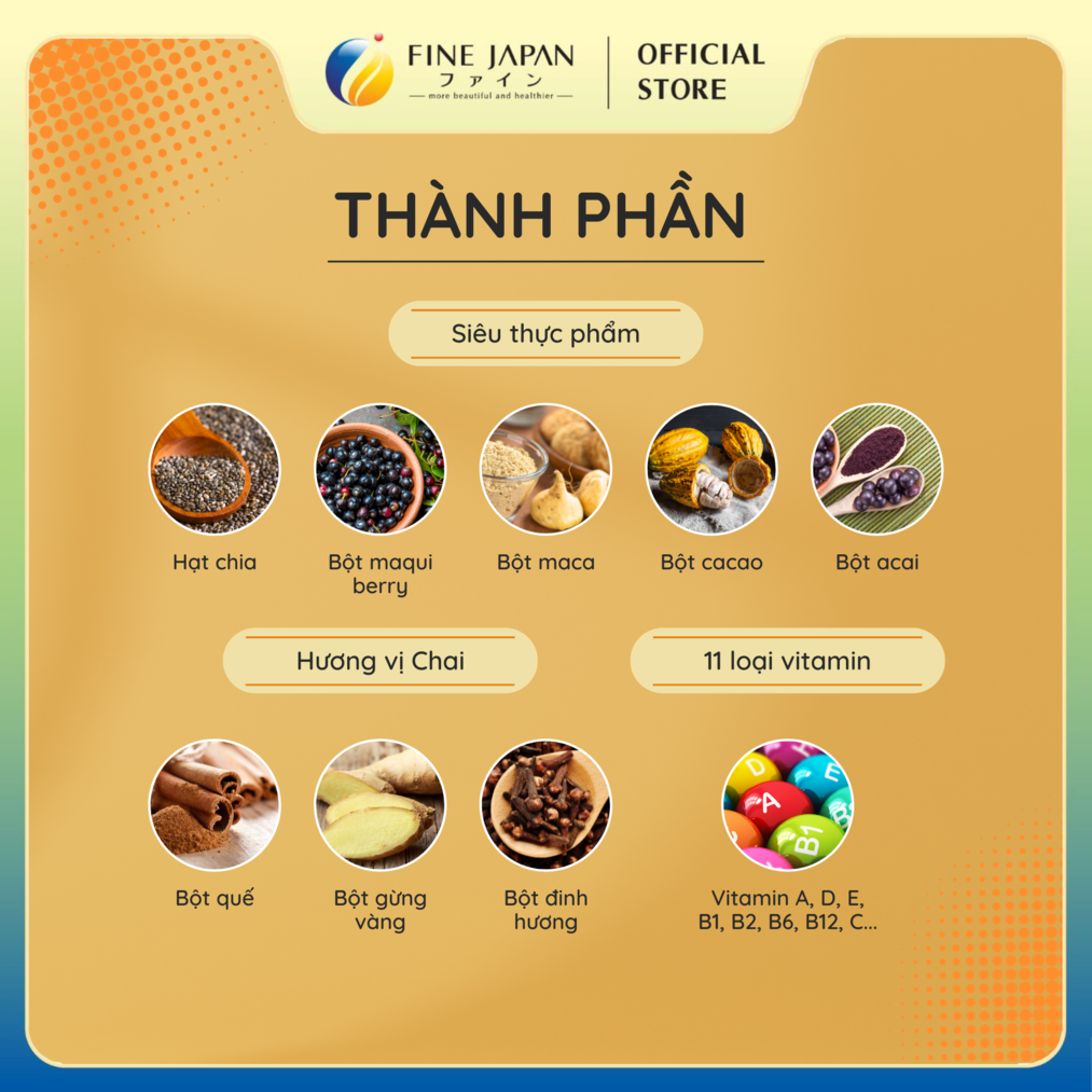 Protein đậu nành dạng bột, chất xơ hòa tan trong nước, maltodextrin, bột đậu nành, dầu Axit béo chuỗi trung bình, dextrin, bột trà Rooibos, hạt Chia, bột gừng vàng, bột quế, thực phẩm làm từ sữa, v.v. bột, bột Acai, bột Maqui berry, bột Maca, bột ca cao, muối, L- carnitine L- tartrate, chiết xuất hạt tiêu đen/chất làm đặc polysacarit, tinh bột biến tính, Vitamin C, chất tạo ngọt (stevia, sucralose), hương liệu, chiết xuất V.E, niacin, Canxi pantothenate, Vitamin B1, Vitamin B6, Vitamin B2, V.A, Axit folic, Vitamin D, Vitamin B12.