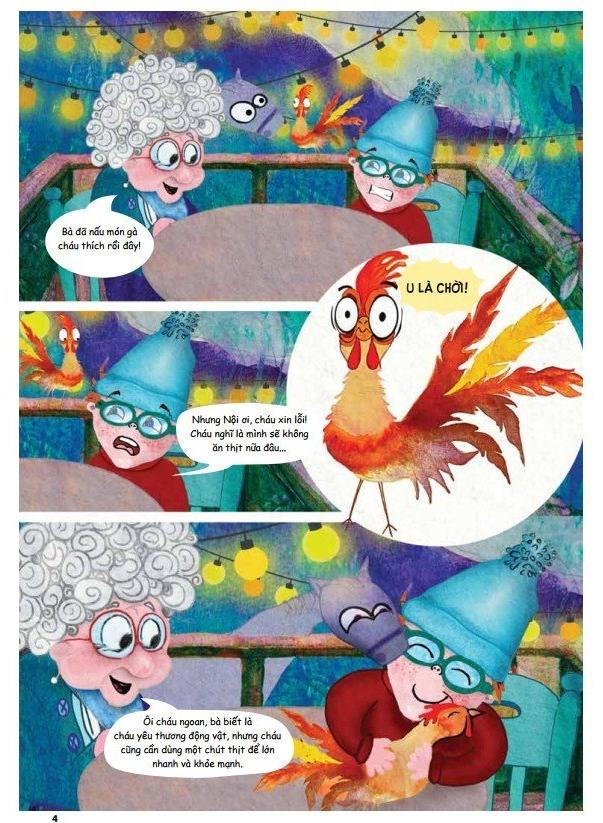 Bớt Thịt Thêm Thương! “Bớt thịt thêm thương” cuốn sách song ngữ dành cho trẻ 6+. Có hơn 84.000 lý do để ăn nhiều rau củ quả hơn và ăn ít thịt lại. Hãy cùng tham gia chuyến du hành xuyên thời gian và không gian trên chiếc phi cơ chuối để tìm hiểu thêm nhé. Trích đoạn sách hay: Nội ơi, cảm ơn bà đã nấu cơm cho cháu. Tối nay, chúng ta sẽ dùng món gì vậy Nội? Bà đã nấu món gà cháu yêu thích rồi đây! Nhưng Nợi ơi, cháu xin lỗi! Cháu nghĩ là m.ình không ăn thịt nữa đâu… Ôi cháu ngoan, bà biết là cháu yêu thương động vật, nhưng cháu cũng cần dùng một chút thịt để lớn nhanh và khoẻ mạnh. Cháu đừng ngại nhé, hãy dùng bao nhiêu gà tuỳ thích! Cảm ơn bà nhưng cháu muốn ăn ra củ quả hơn. Sao chỉ ăn rau củ quả mà cháu khoẻ mạnh thế kia? Thật không thể tin được! Ước gì tớ là một chú tinh tinh khoẻ mạnh! Cậu không cần phải trở thành tinh tinh giống tớ đâu. Con người và “mọi loài động vật” đều có thể trở nên khoẻ mạnh hơn nhờ ăn rau củ quả. Chúng chứa những nguồn dưỡng chất vô cùng bổ dưỡng. Để tớ đưa bà và cậu đi tham quan bằng phi cơ chuối nhé!