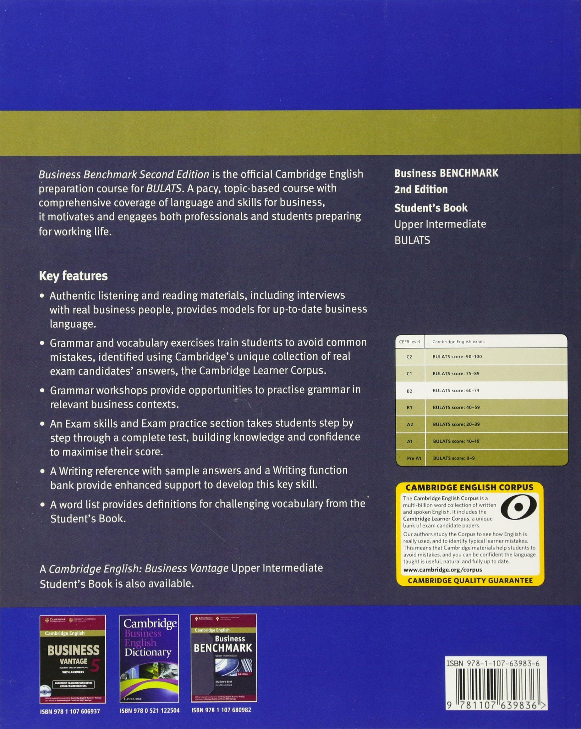 Business Benchmark Second edition is the official Cambridge English preparation course for Cambridge English: Business Preliminary, Vantage and Higher (also known as BEC), and BULATS. A pacy, topic-based course with comprehensive coverage of language and skills for business, it motivates and engages both professionals and students preparing for working life. The Upper Intermediate BULATS Student's Book contains authentic listening and reading materials, including interviews with business people, providing models for up-to-date business language. Grammar and vocabulary exercises train students to avoid common mistakes, identified using Cambridge's unique collection of real exam candidates' answers. 'Grammar workshops' practise grammar in relevant business contexts. A Cambridge English: Business Vantage version of this Student's Book is also available.