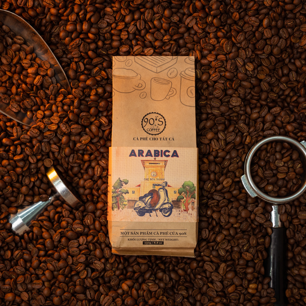 Cà phê hạt Arabica thuộc dòng sản phẩm cà phê rang mộc nguyên chất của 90S Coffee Vietnam. Đây là sản phẩm rất được ưa chuộng trong ngành cà phê bởi đặc tính đa dạng &