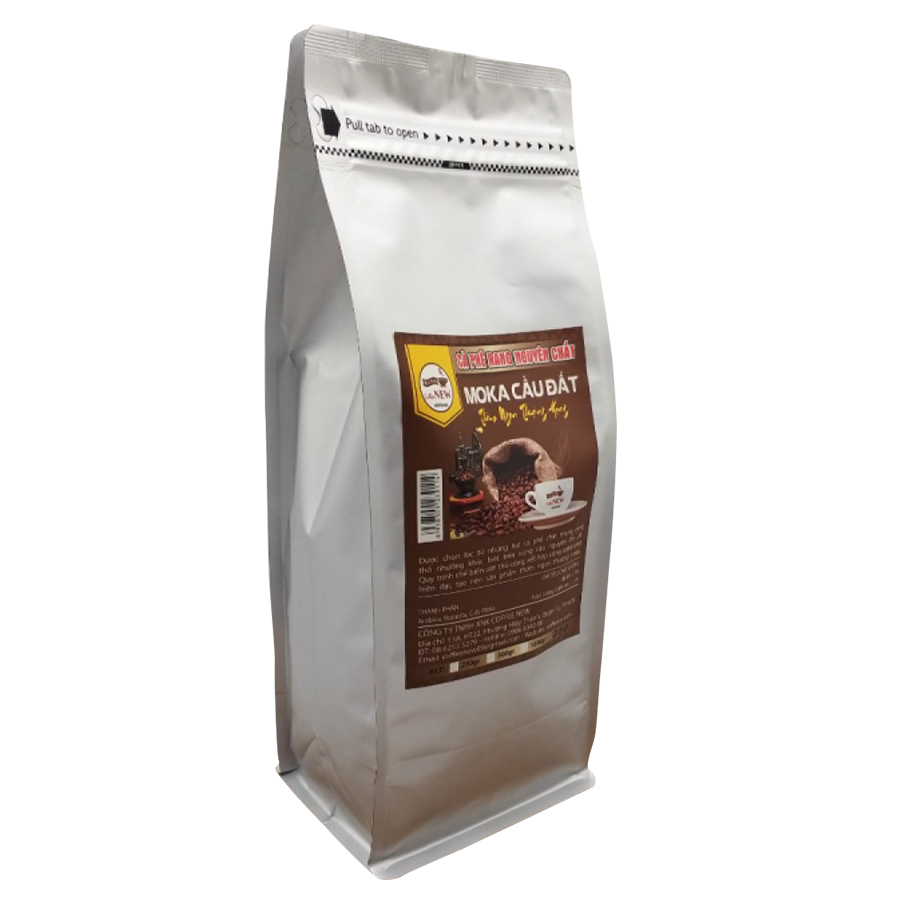 Cà phê MOKA - Rang Mộc Nguyên Chất (Gói 1000gr) - Dạng Hạt Pha Máy Hoặc Pha Phin   Cà phê Moka Cầu Đất - Đà Lạt là loại cà phê không chỉ nổi tiếng ở Việt Nam, mà hầu hết những nhà rang xay cà phê chuyên nghiệp đều biết đến bởi chất lượng không thua kém bất kỳ loại cà phê thơm ngon nào trên thế giới.   Được mệnh danh là "nữ hoàng cà phê" vì sự quý hiếm và hương thơm quyến rũ đặc biệt của nó. Moka Cầu Đất có giá trị cao nhất Việt nam và có chất lượng hương vị sánh ngang với cà phê ngon nhất thế giới là giống cà phê Arabica Bourbon (do Pháp du nhập vào Việt Nam) được trồng tại Cầu Đất, xã Xuân Trường, Thành phố Đà Lạt. Với độ cao từ 600m đến 1.500m so với mực nước biển, có dãy vĩ độ, điều kiện thổ nhưỡng, khí hậu tương đồng với Comlombia và Brazil – nơi trồng loại cà phê Arabica nổi tiếng nhất thế giới. Khí hậu ôn đới mát quanh năm, khí hậu lạnh với nắng nhẹ vào ban ngày cùng sương xuống vào ban đêm, thiên nhiên đã tạo cho Moka Cầu Đất một thứ hương thơm ngây ngất, vị ngòn ngọt làm say đắm những người sành điệu hương vị của Moka, được miêu tả như một nữ hoàng, tỏa sáng một cách rất đặc biệt, vừa sang trọng lại vừa thanh thoát, ngây ngất, có vị chua nhưng cái chua rất thanh thoát, mùi thơm trái cây chín, sang trọng mang nét cổ điển và dành cho những người sành điệu.    Moka Cầu Đất được chọn lựa cẩn thận nguyên liệu đầu vào là hạt Moka Cầu Đất 100% và được rang cẩn thận và tỉ mỉ bởi thợ rang chuyên nghiệp theo công nghệ rang hiện đại Châu Âu trong một quy trình khép kín.        Bạn có phải là người yêu cà phê không? Và bạn quan tâm đến việc phân biệt 1 người uống cà phê lành mạnh? Và làm thế nào để biết cà phê bạn mua về thực sự là loại cà phê thật? Và làm sao để nhận biết đâu là một sản phẩm cà phê nguyên chất, cà phê thật tốt cho sức khỏe?   Đây là sản phẩm trả lời cho câu hỏi của bạn Cà phê là một loại hạt rất đặc biệt và khác biệt, có thể dễ dàng phân biệt cà phê nguyên chất và cà phê giả, bột cà phê thật với bột của các loại hạt ngũ cốc khác. Để bảo đảm cho sức khỏe và khẩu vị thưởng thức cà phê đích thực của chính bạn, bạn cần ghi nhớ vài chi tiết căn bản về thuộc tính của hạt cà phê rang rất khác với các loại hạt rang khác và bột của chúng.          Với phương châm và Slogan: "VÌ SỨC KHỎE TƯƠNG LAI" nên tôi hiểu tại sao và phải làm gì để sản phẩm cà phê sạch đến với tất cả mọi người. Góp phần đẩy lùi dòng cà phê bẩn đang hoành hành trên thị trường.      Rang, xay và đóng gói cà phê MOKA