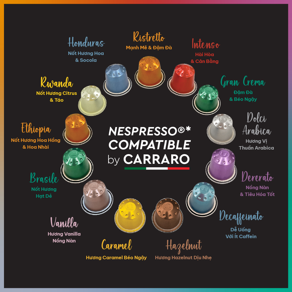 Nespresso là Thương hiệu được sở hữu bởi Nestle Quý khách vui lòng xem hương vị và số lượng sản phẩm trong phân loại NGUỒN GỐC CỦA HƯƠNG VỊ CÀ PHÊ CARRARO "Mỗi tách cà