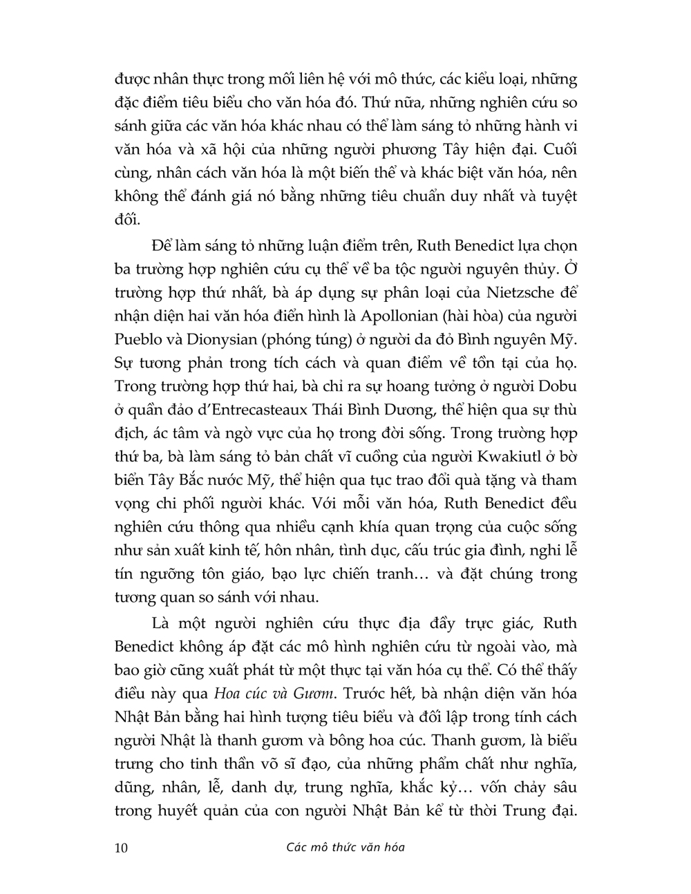 Mua tại TiktokMột văn hóa có thể nhìn nhận như một nhân cách cá nhân và mỗi cá nhân trong một văn hóa có thể được nhân thực trong mối liên hệ với mô thức, các kiểu loại, những đặc điểm tiêu biểu cho văn hóa đó. Sách Các Mô Thức Văn Hóa làm rõ các luận điểm: Khoa học về phong tục; Sự đa dạng của văn hóa; Sự hội nhập của văn hóa; Bản chất của xã hội,…