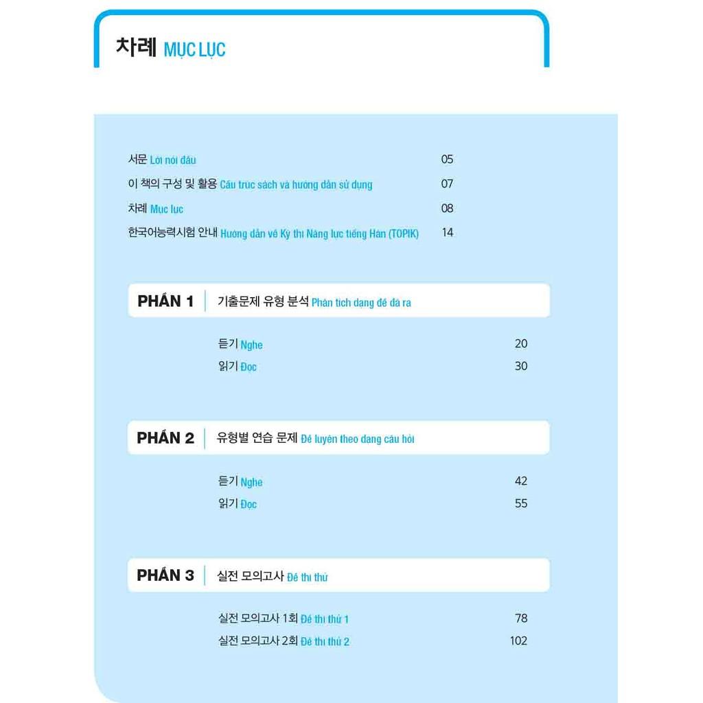 Thi thử như thật bằng đề thi thử có kèm theo phần giải thích song ngữ Hàn-Việt ở Phụ lục nhằm chuẩn bị hoàn hảo cho kỳ thi TOPIK.