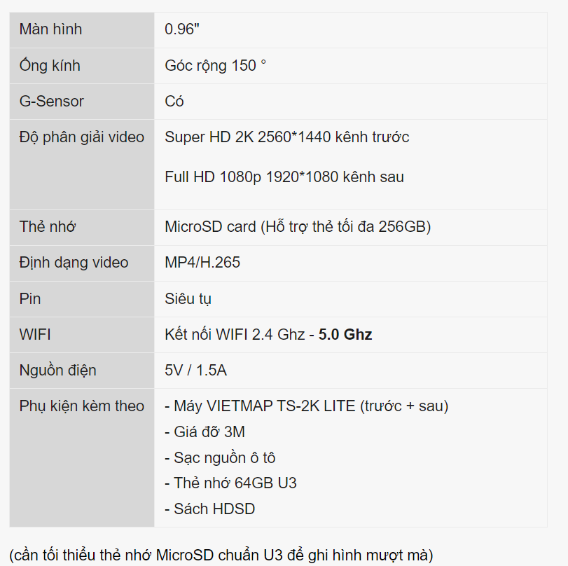 - Model: TS-2K Lite - Ghi hình 2 kênh trước sau, trước 2K, sau Full HD - Là dòng camera thuần ghi hình, không có cảnh báo giao thông bằng giọng nói Camera VIETMAP TS-2K