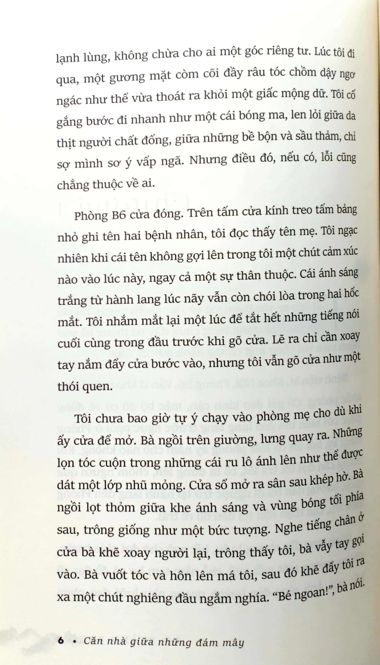 Nhưng sẽ đến một lúc nào đó, trên hành trình quan sát và dõi theo dòng chảy mê mải ấy, người đọc sẽ nhập hẳn vào câu chuyện. Sẽ đến lúc người đọc thấy những mây mù hồi ức ấy không còn là của riêng người kể chuyện. Đến một lúc nào đó, độc giả sẽ hoán thai đoạt cốt câu chuyện của tôi, để đến lượt mình, thức dậy câu chuyện của những tôi - khác, từ trong Căn nhà giữa những đám mây.”