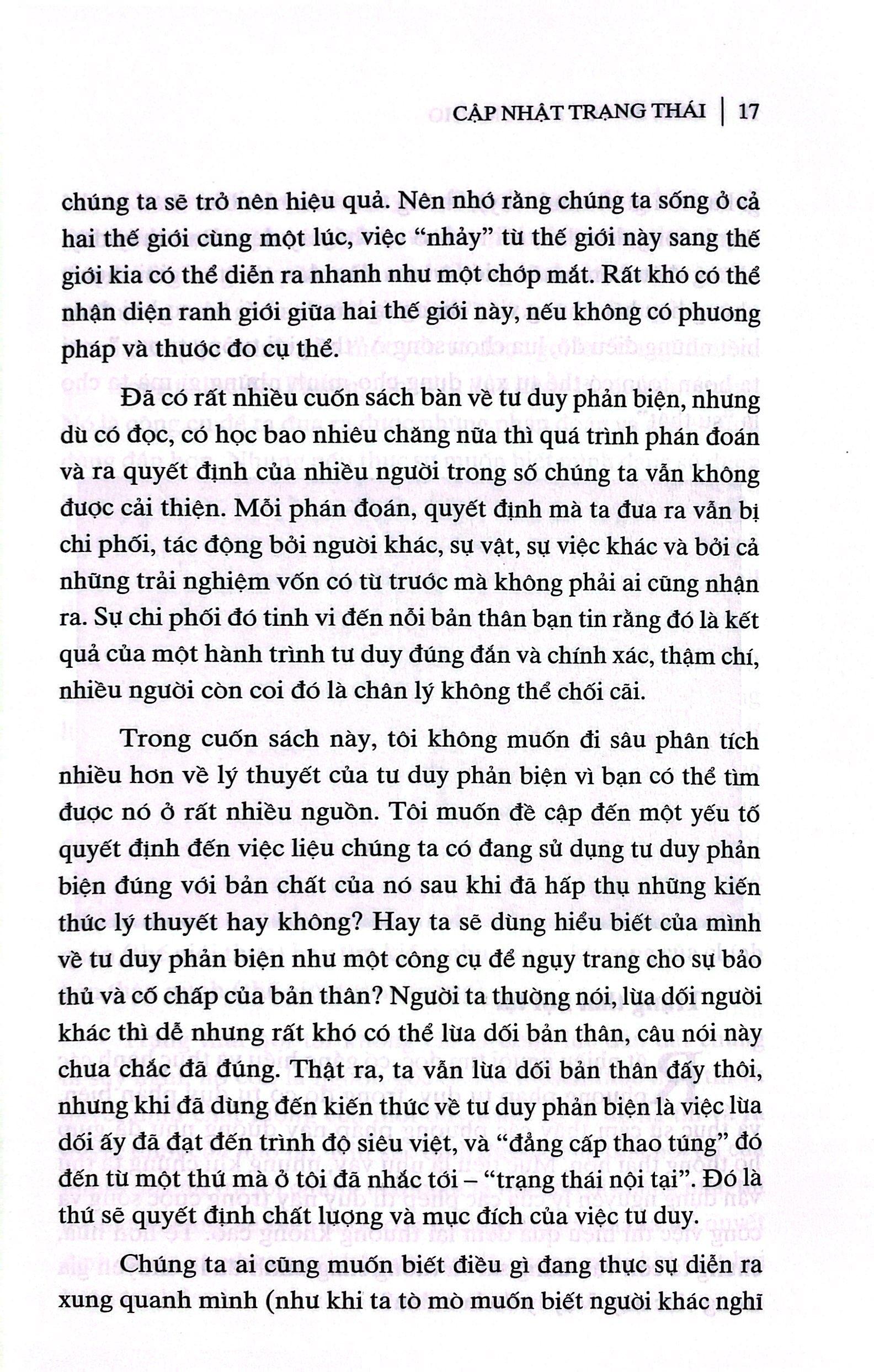 Cáo, Bò Tót Và Chùm Nho Chắc hẳn bạn đã từng nghe kể hoặc đọc câu chuyện ngụ ngôn nổi tiếng “Con cáo và chùm nho” của nhà văn Aesop. Vậy bạn còn nhớ những gì về chú cáo trong câu chuyện đó ngoại trừ việc nó không hái được nho, chê nho xanh và chua, sau đó rời đi? Bạn đã từng bao giờ thấy bản thân m.ình trong chú cáo đó chưa? Bạn đã từng muốn “hái” một “chùm nho” nào đó mà không thực hiện được, sau đó tức tưởi bỏ qua và tự nhủ rằng nó “xanh” và “chua”, từ đó hợp lý hóa cho quyết định bỏ cuộc của m.ình? Trong cuốn sách này, bằng việc xây dựng lại cốt truyện, Cáo đã có thêm Bò tót làm bạn đồng hành trên hành trình tìm kiếm và hái những chùm nho. Câu chuyện mới được kể lại và phân tích qua 9 chương từ góc nhìn tâm lý học, người đọc sẽ đồng hành cùng Cáo và Bò tót trong quá trình phán đoán, tiếp nhận, xử lý thông tin, đi kiếm tìm và giao dịch những chùm nho quý báu. Khi khép lại cuốn sách, người đọc sẽ giật m.ình nhận ra rằng trong khi dành phần lớn thời gian để suy nghĩ và hành động một cách bản năng, chúng ta lại tự cho rằng m.ình sáng suốt và lý trí, thực tế này đến ngay cả khi chúng ta đã cố gắng áp dụng các phương pháp tư duy phản biện đã học hay đọc được ở đâu đó. Thông qua hành trình cùng hai nhân vật, người đọc có thể tự vẽ ra bối cảnh rằng m.ình đang đi rừng, leo núi hay bất cứ hoạt động nào khác để tới với những “chùm nho”. Tuy nhiên mục tiêu đó đòi hỏi phải đối diện với sự phức tạp và biến thiên của thế giới thực. Nó hiện hữu, xảy ra thường xuyên đến mức ta buộc phải liên tục suy nghĩ và đưa ra phán đoán, tìm ra phương án giải quyết từ những việc nhỏ nhặt nhất hàng ngày như việc tắt chuông báo thức mỗi sáng cho đến đến những quyết định ảnh hưởng to lớn đến chất lượng cuộc sống và công việc trong suốt cuộc đời. Không chỉ dừng ở đó, cuốn sách còn cung cấp cho người đọc một loạt giải pháp để có thể thực sự làm chủ cách chúng ta suy nghĩ và sử dụng tri thức – thứ mà chúng ta tưởng rằng chỉ thuộc quyền sở hữu của bản thân và bất khả x.âm phạm. Đã bao giờ bạn nghe thấy, hoặc tự hỏi m.ình những câu hỏi sau mà chưa có đáp án thỏa mãn:
