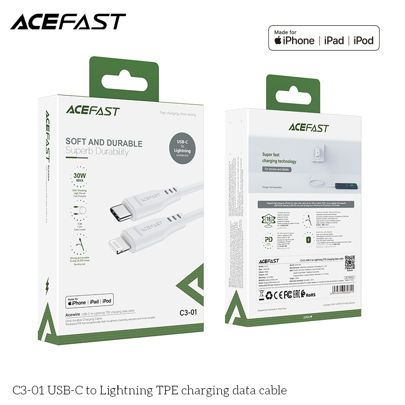 Mua tại TiktokCáp ACEFAST C3-02 , dòng điện lên đến 2,4A, chiều dài 1.2m, chất liệu TPE, chứng nhận M.F.I