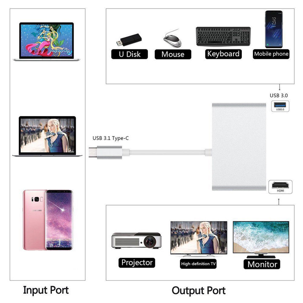 - Mô Tả Sản Phẩm: - Bộ chuyển đổi đa năng USB 3.1 Type-C sang HDMI / USB 3.0 / USB-C - Sạc máy tính xách tay / điện thoại - Với cổng HDMI -