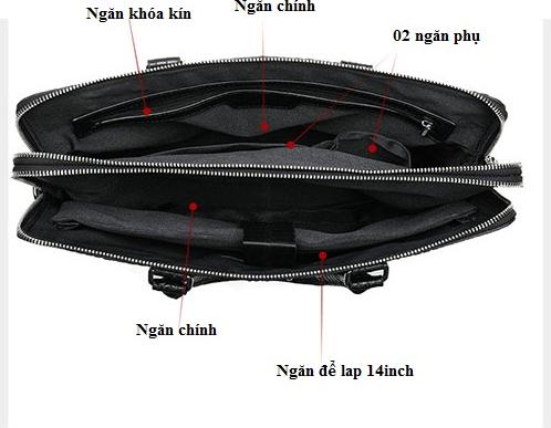 Bên trong cặp được lót 1 lớp vải chống va đập và bảo vệ đồ dùng được tốt hơn. Với 2 ngăn chính rộng, 1 ngăn để laptop 14inch, 02 ngăn phụ nhỏ, 01 ngăn khóa kéo kin, 01 ngăn khóa kéo phía sau cặp.