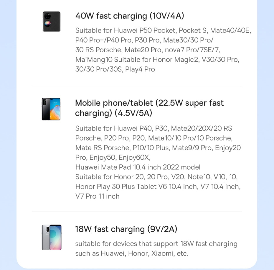 + 40W(10V/4A) sạc nhanh: Huawei Mate40/40E, P40 Pro/P40 Pro +, P30 Pro, Mate30/30 Pro/30 RS, Mate20 Pro, Nova7/7 SE/7 Pro. Honor Magic2, V30/30 Pro, 30/30 Pro/30S, Play 4 Pro.