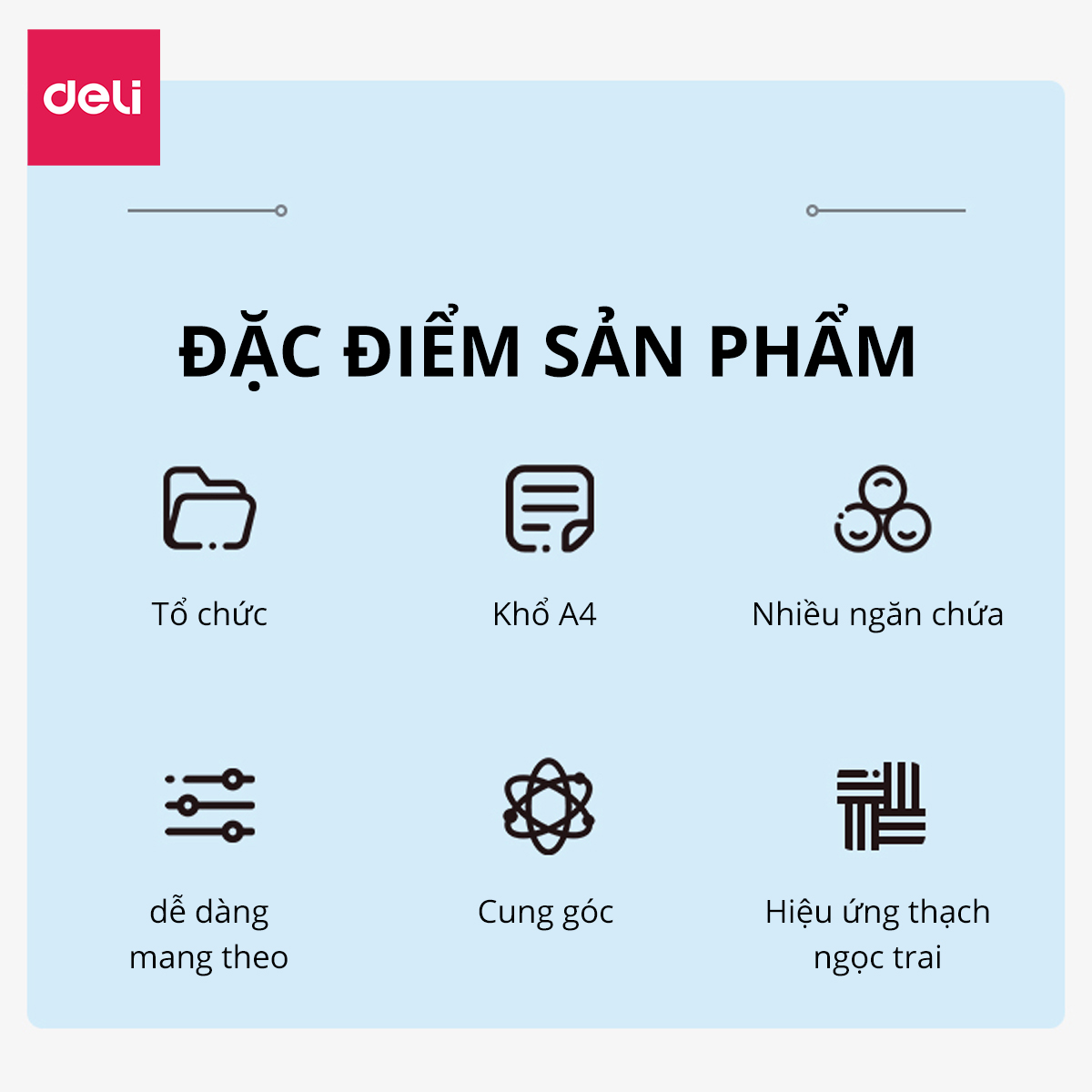 Cặp Tài Liệu A4 5559 Deli Cặp Tài Liệu A4 5559 Deli 12 ngăn, có quai xách và nắp cài tiện dụng, thời trang, dễ dàng mang theo bên mình. Nút cài bằng nhựa dễ
