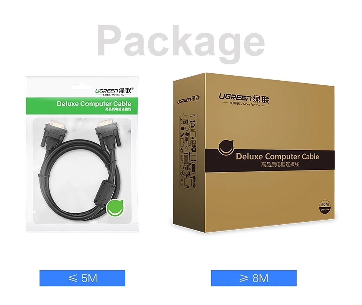 Ugreen 11606 Cáp DVI 24+1 Dài 1.5M DVI24+1 male to male cable gold plated DV101 1. Length : 1.5M 2. Color : Black 3. DVI24+1 male to male cable gold plated 4. 250 g 5.