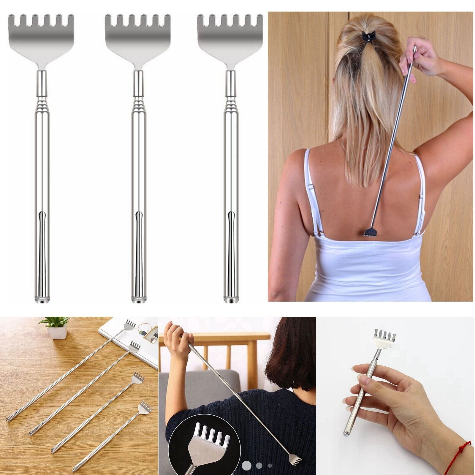 - Vô cùng hữu ích đối với người lớn tuổi, giới văn phòng, người lao động tay chân… . Cây gãy lưng inox kéo dài tiện dụng Chiều dài: 16.7 cm Kéo dài tối đa: 51.6 cm Chiều rộng: 3.3 cm Thiết kế nhỏ gọn , tiện dụng Giúp xoa dịu những vùng bị ngứa mà khó khăn để thực hiện Có thể rút gọn thành cây anten nhỏ, có móc treo.