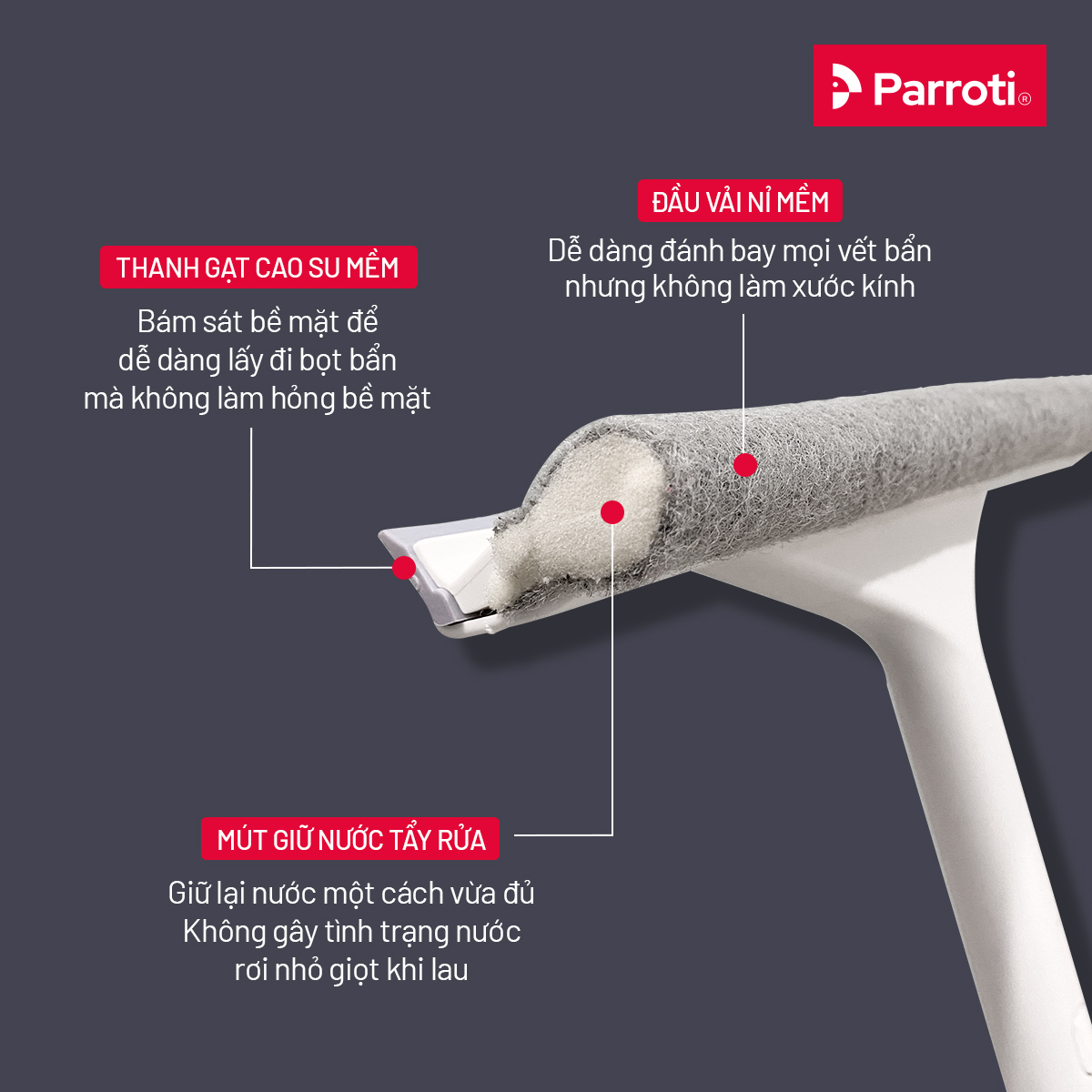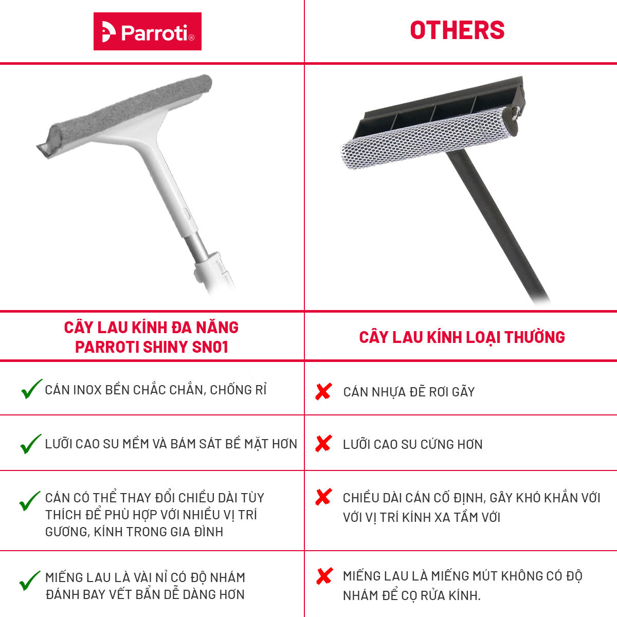 - Tên sản phẩm: Cây lau chùi kính 2 trong 1 Parroti Shiny SN01