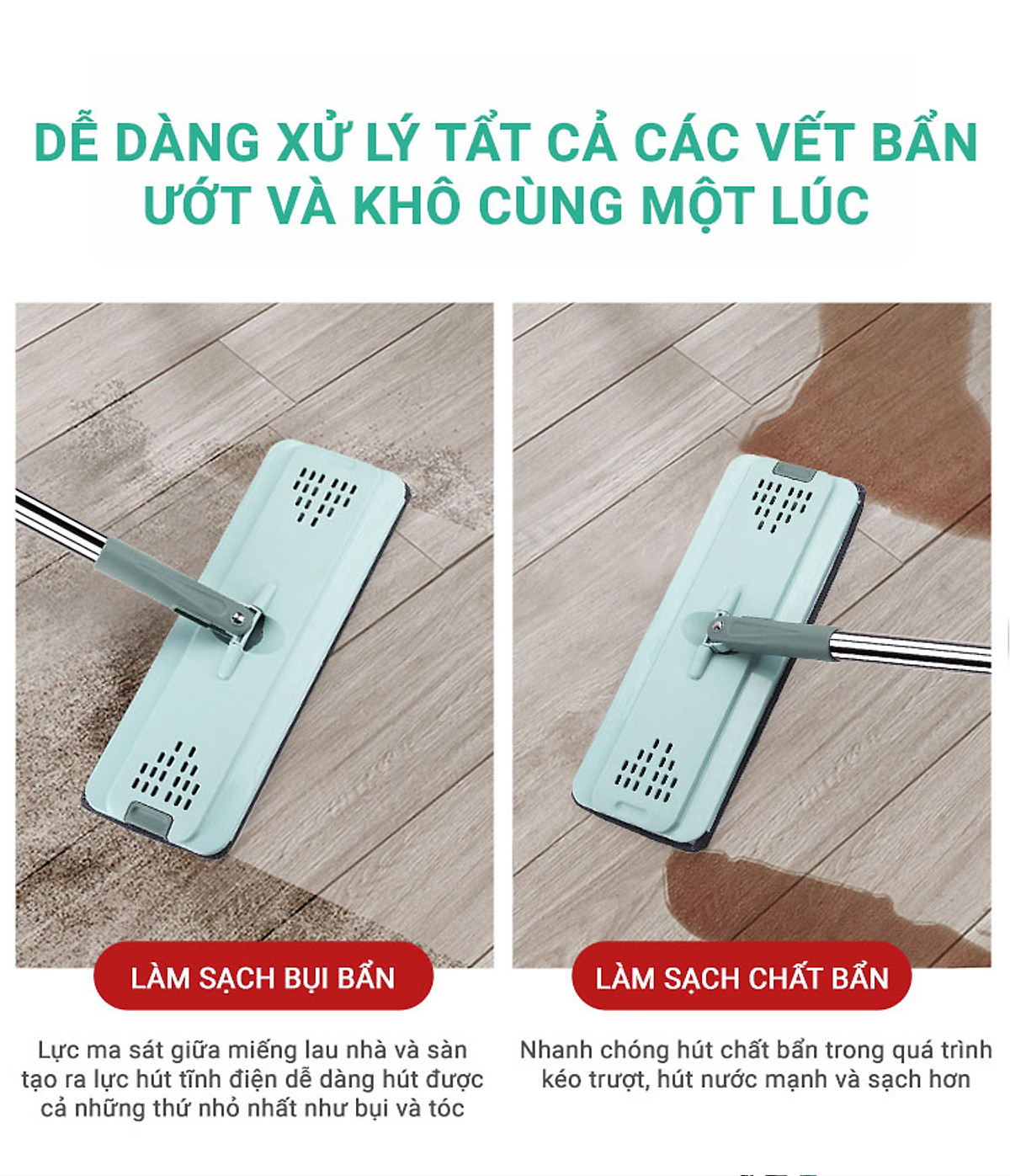 - Thiết kế gọn nhẹ, thoải mái khi di chuyển mà không tốn sức - Mâm lau hình chữ nhật, diện tích rộng giúp làm sạch nhanh chóng - Mặt lau làm bằng sợi dệt