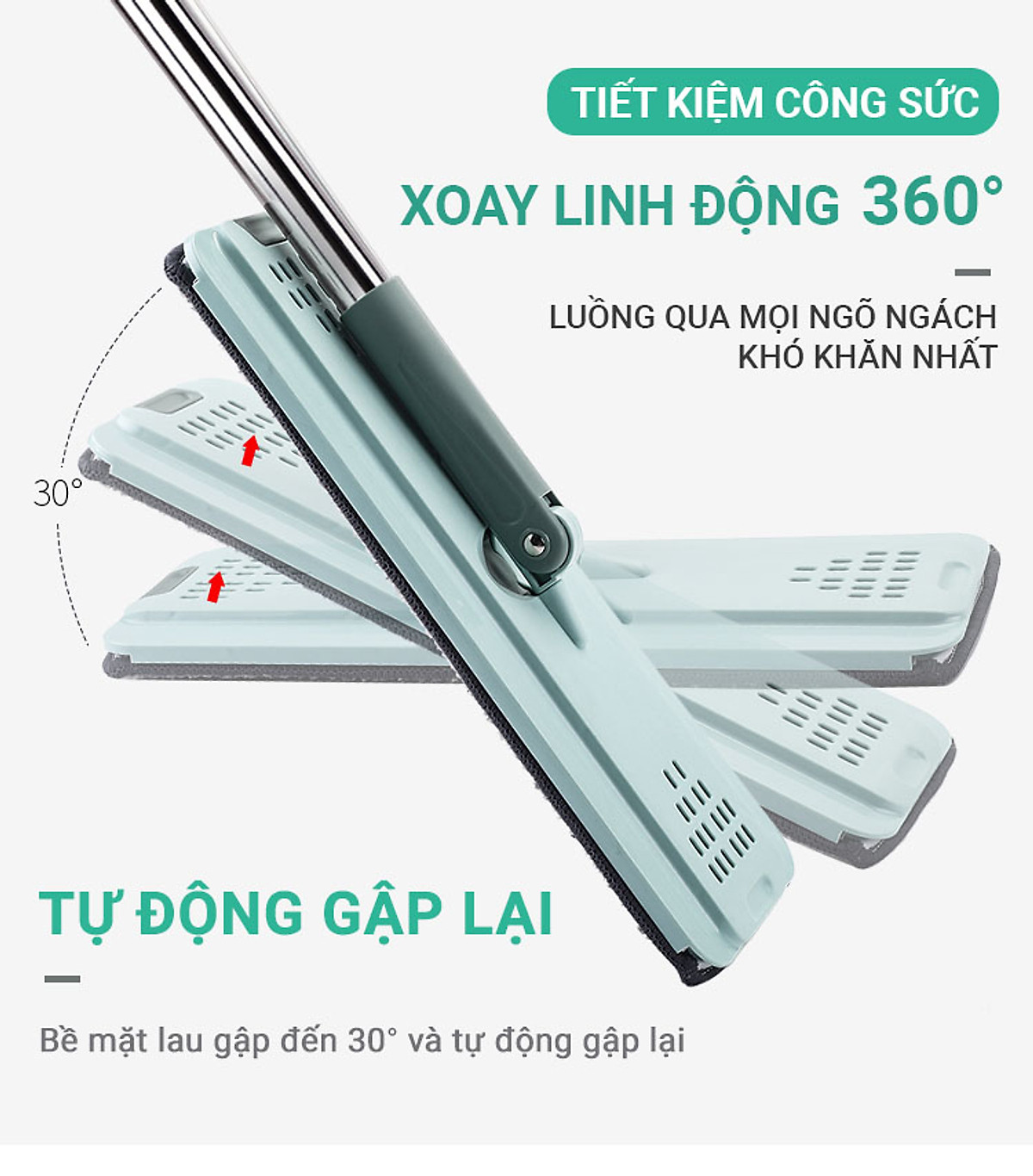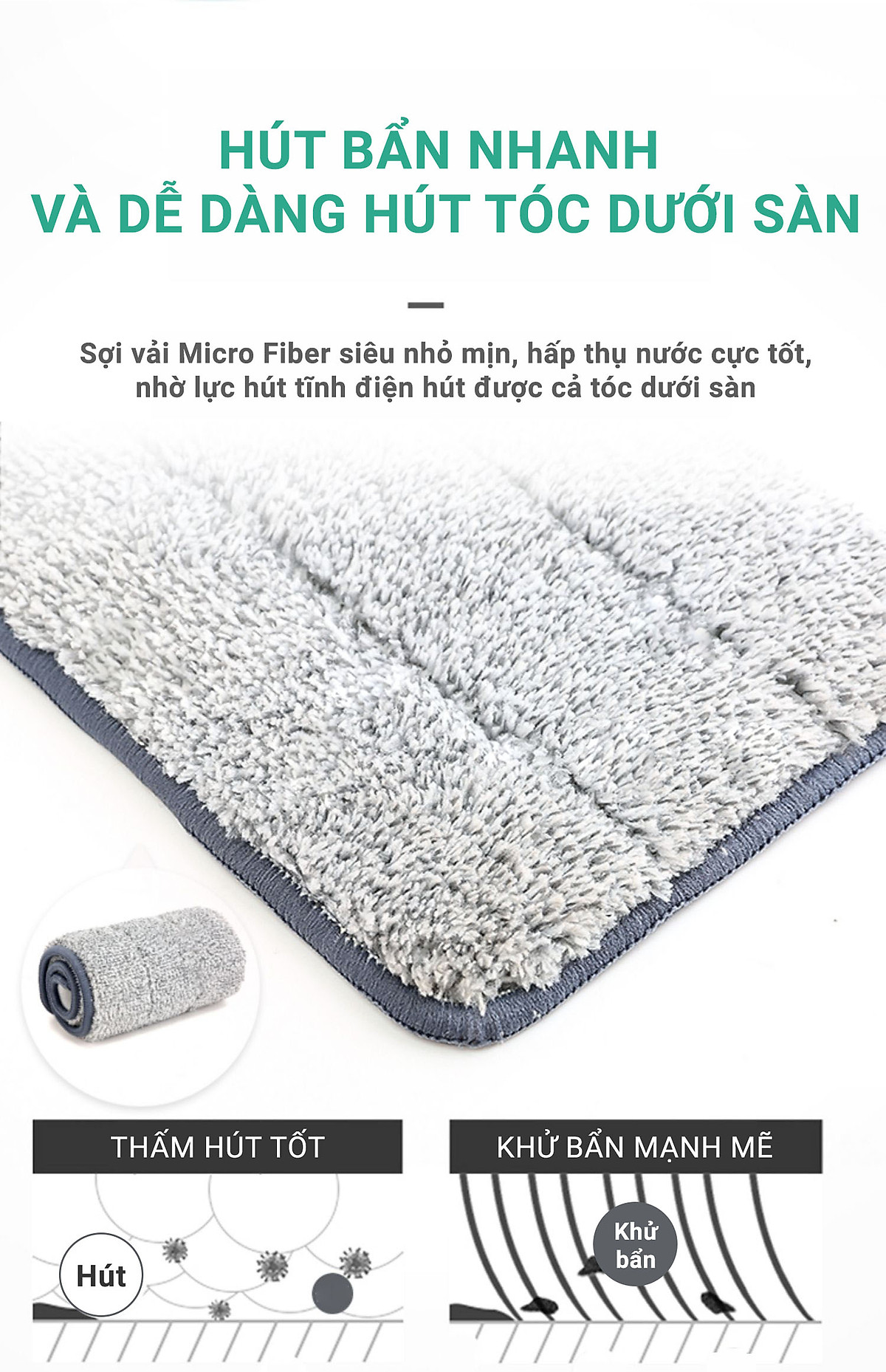 ĐẶC ĐIỂM NỔI BẬT: Chất liệu cao cấp, an toàn cho sức khỏe Cán bằng inox 201 có tay cầm bọc nhựa PP chắc chắn Bông lau bằng sợi Microfiber thấm hút nước tốt Thiết