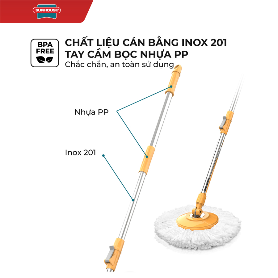 Cây lau nhà xoay 360 độ SUNHOUSE KS-MO350I có cán làm bằng inox 201 với tay cầm bằng nhựa PP cao cấp, chắc chắn, không bị han gỉ và có thể tháo lắp dễ dàng khi sử dụng. Cây lau có thể điều chỉnh độ dài 950-1200mm giúp bạn dễ dàng lau dọn cả những nơi ẩn khuất như gầm giường, tủ hay những vị trí cao không với tới.