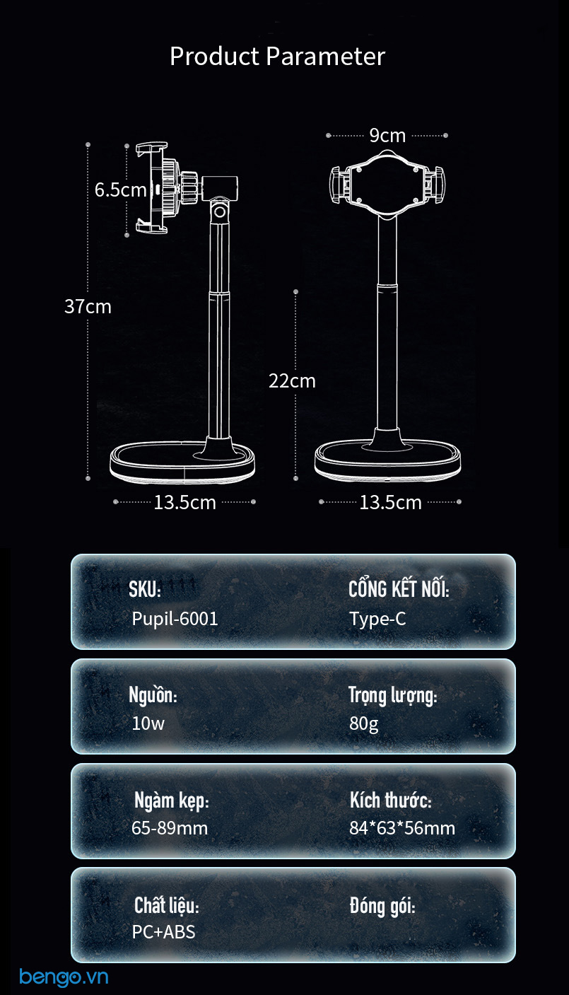 - Ngàm kẹp 6-9cm (nhỏ nhất - to nhất) kẹp được nhiều loại điện thoại khác nhau
