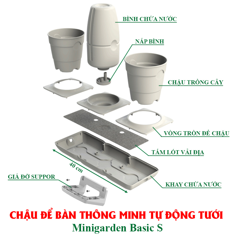 1. CHỨC NĂNG CHẬU TRỒNG CÂY TỰ DƯỠNG BASIC S: - Nhập khẩu: Minigarden Bồ Đào Nha - Chậu trồng cây tự dưỡng Basic S tự động tưới và tự cân bằng độ ẩm cho